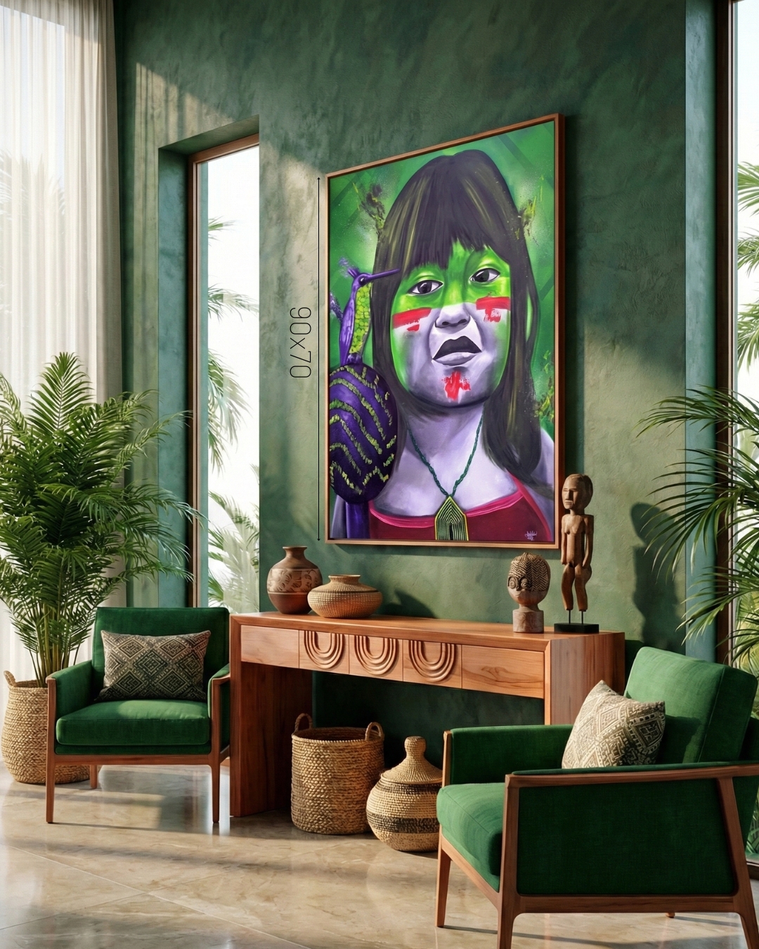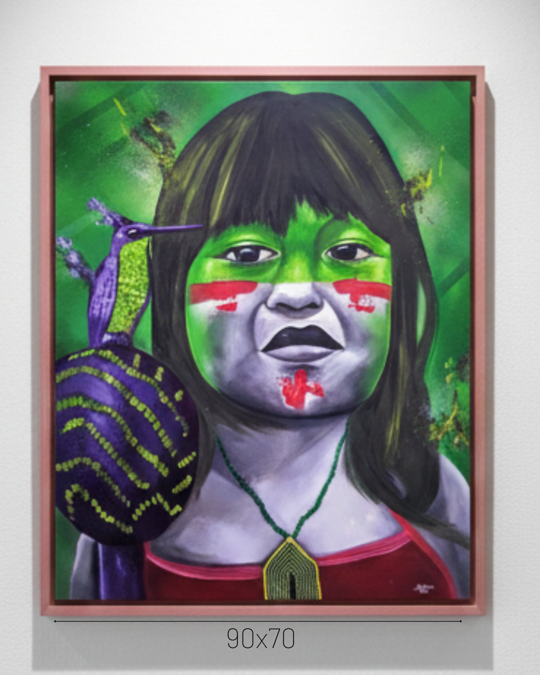 Nesta composição de 2020, somos confrontados pelo olhar profundo e resiliente da juventude indígena. A obra transcende o retrato convencional, mergulhando em uma paleta vibrante onde o verde da mata se funde à identidade da figura central.