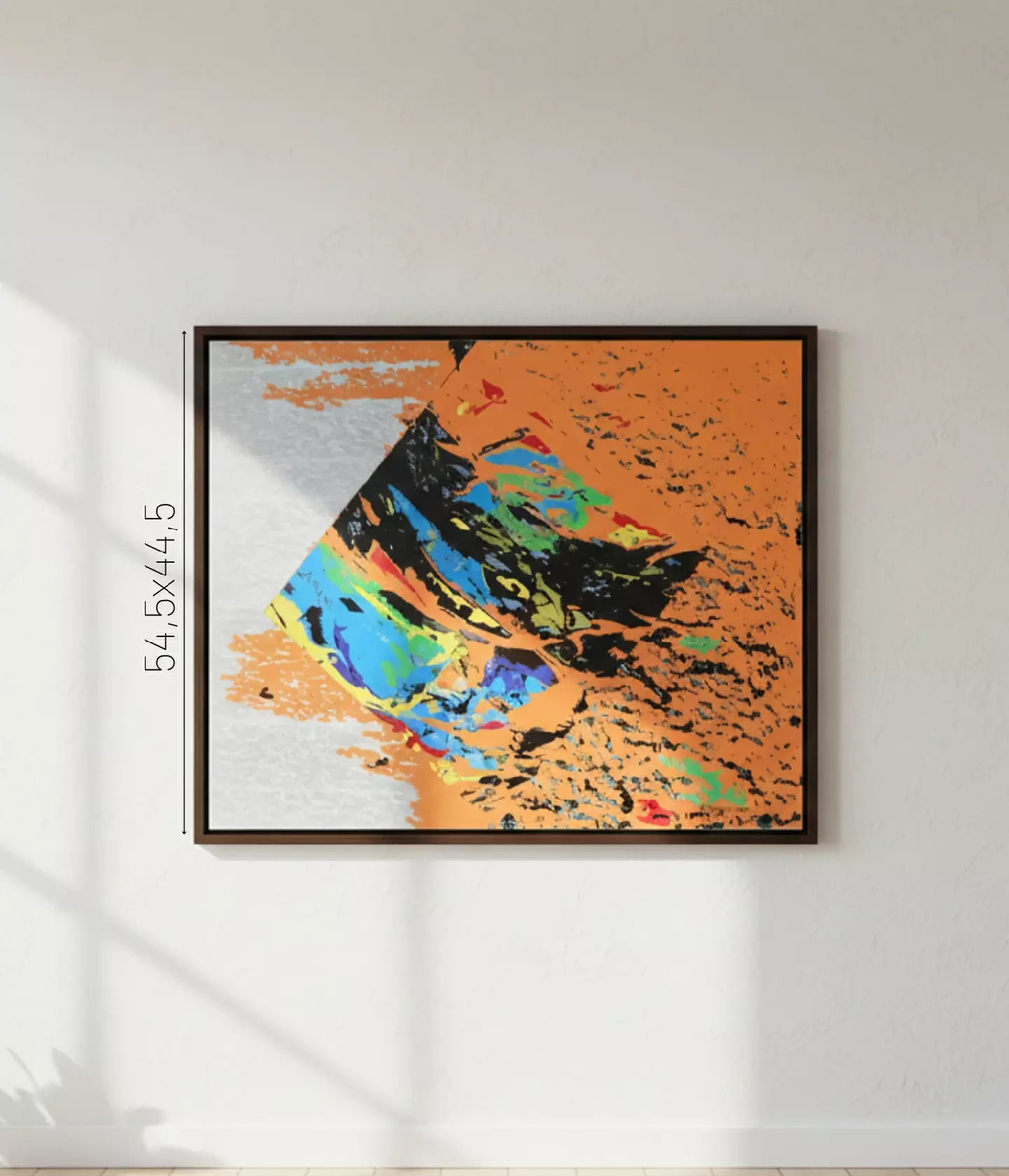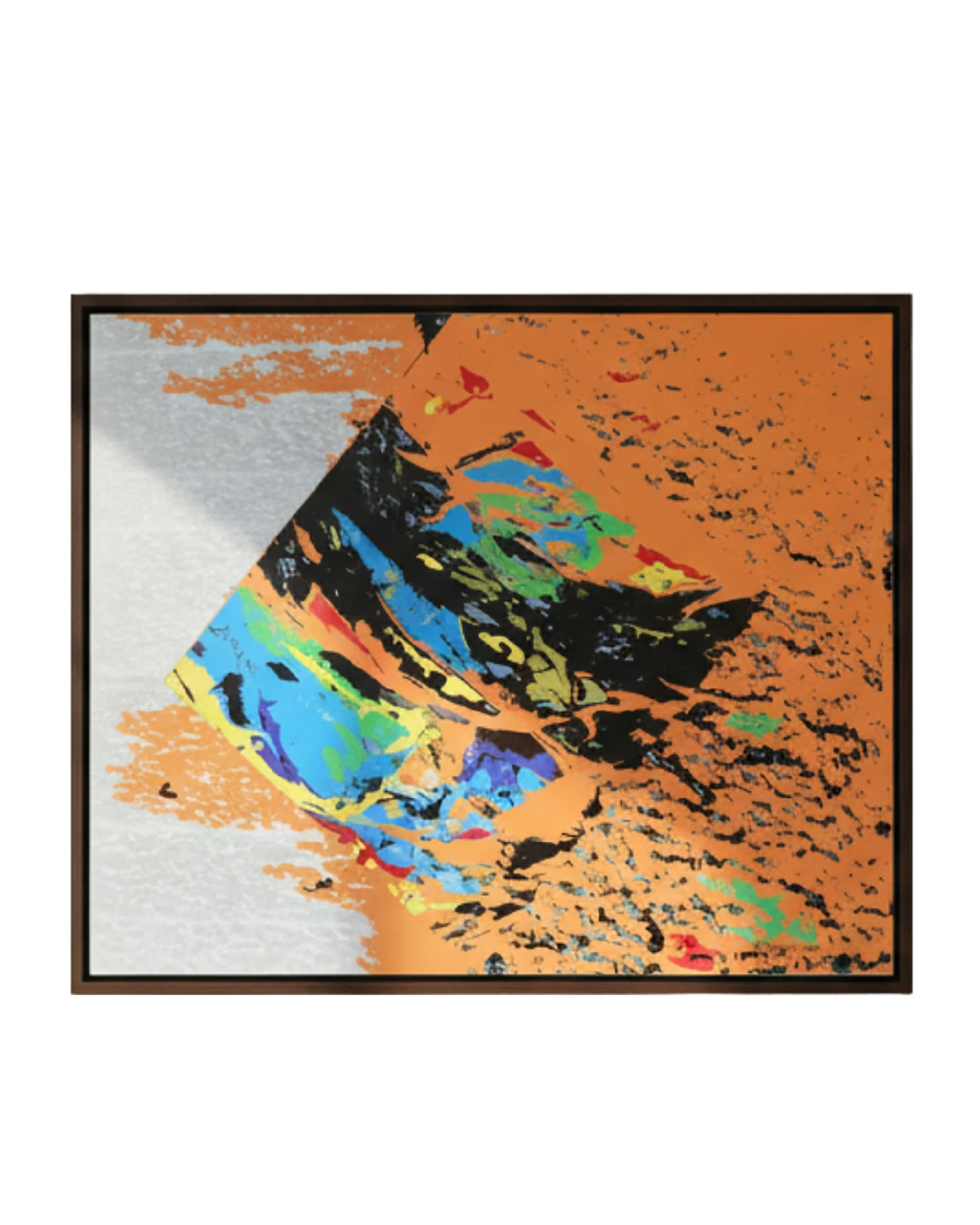A Ruptura: A transição entre os elementos não é suave. O losango parece despedaçar o fundo ou, inversamente, está sendo consumido e espalhado pelos respingos e rastros que se espalham da forma geométrica para o campo laranja. Essa técnica de dispersão gráfica remete a explosões de energia ou à desintegração de uma estrutura para dar lugar a algo novo.