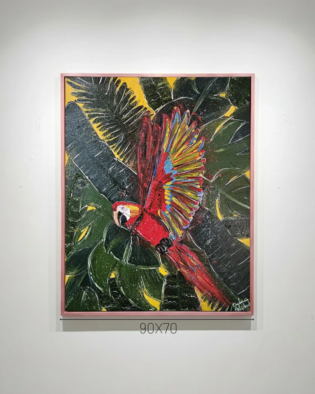 Verticalidade Imponente: Com dimensões de $90 \times 70 \text{ cm}$, a obra possui uma presença física marcante, preenchendo o espaço com uma aura de vitalidade e frescor.