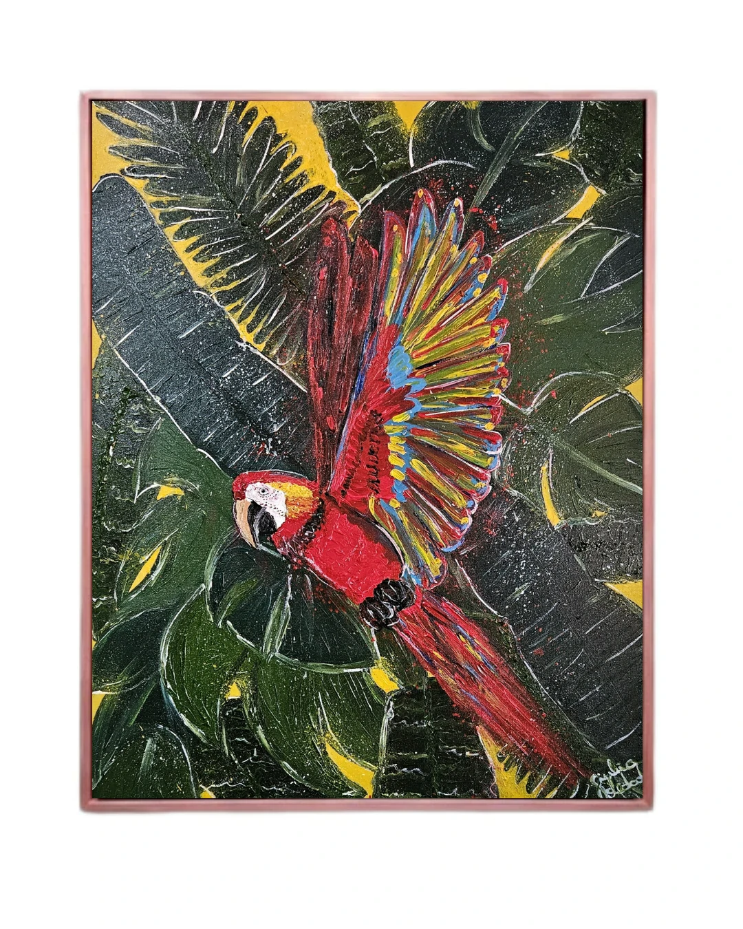 Riqueza Matérica: A aplicação generosa da tinta cria relevos que mimetizam a rusticidade das folhas e a leveza das penas. O acabamento envernizado finaliza a peça com um brilho que remete à luz tropical incidindo sobre a umidade da mata.