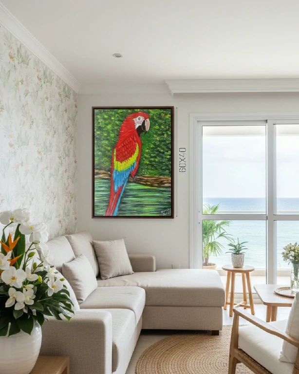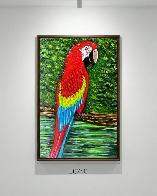 A arara está tranquilamente pousada em um galho, mas sua postura e cores transmitem uma energia poderosa e exótica. É uma obra que tem a capacidade de transformar o astral de qualquer cômodo, adicionando profundidade, cor e um toque de calor tropical.