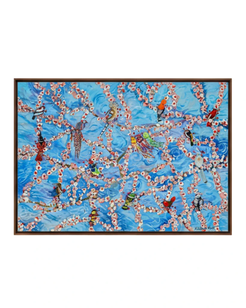 A escolha cromática de Alcir é estratégica: o verde vibrante da pintura facial, que emoldura os olhos, cria um contraste orgânico com os tons terrosos e dourados do plano de fundo, sugerindo uma aura de luz que emana da própria figura. As penas em azul e verde, que adornam o pescoço, introduzem um ritmo fluido à obra, suavizando a densidade dos cabelos negros que estruturam a tela. Sob a ótica da curadoria, a técnica da acrílica é manuseada aqui para alcançar uma textura que transita entre o realismo da pele e a abstração do ambiente, resultando em uma peça que harmoniza o vigor da cultura brasileira com uma estética de design refinada. É uma obra que não se limita a decorar um espaço; ela o define, transformando qualquer ambiente em um palco de celebração da dignidade e da beleza nativa.
