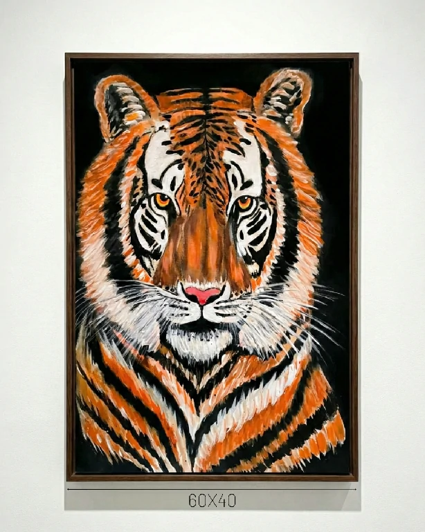 Nesta tela, CACAU captura a imponência e a intensidade do tigre de forma espetacular. O fundo negro profundo realça o laranja vibrante e os brancos cremosos da pelagem, criando um contraste dramático que prende o olhar.