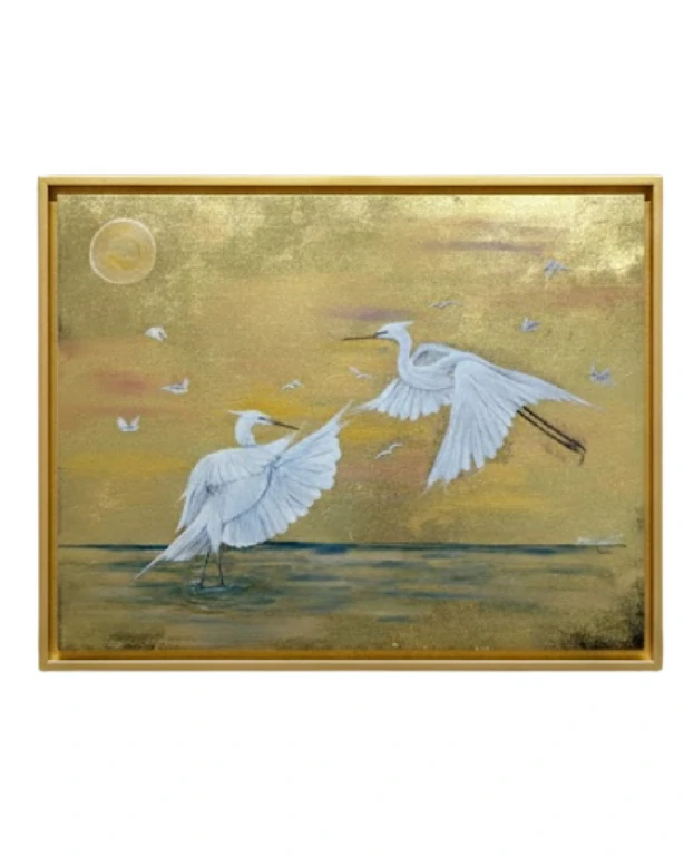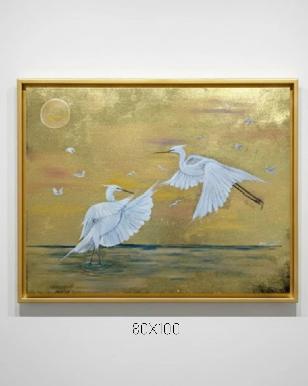 Enquanto as garças são detalhadas em óleo sobre tela, com uma plumagem branca que reflete a pureza e a leveza, o fundo dourado irradia uma energia que evoca tanto o amanhecer quanto o entardecer de uma jornada. A composição sugere que, para além da forma física, existe um fluxo contínuo de vida que se renova a cada bater de asas.