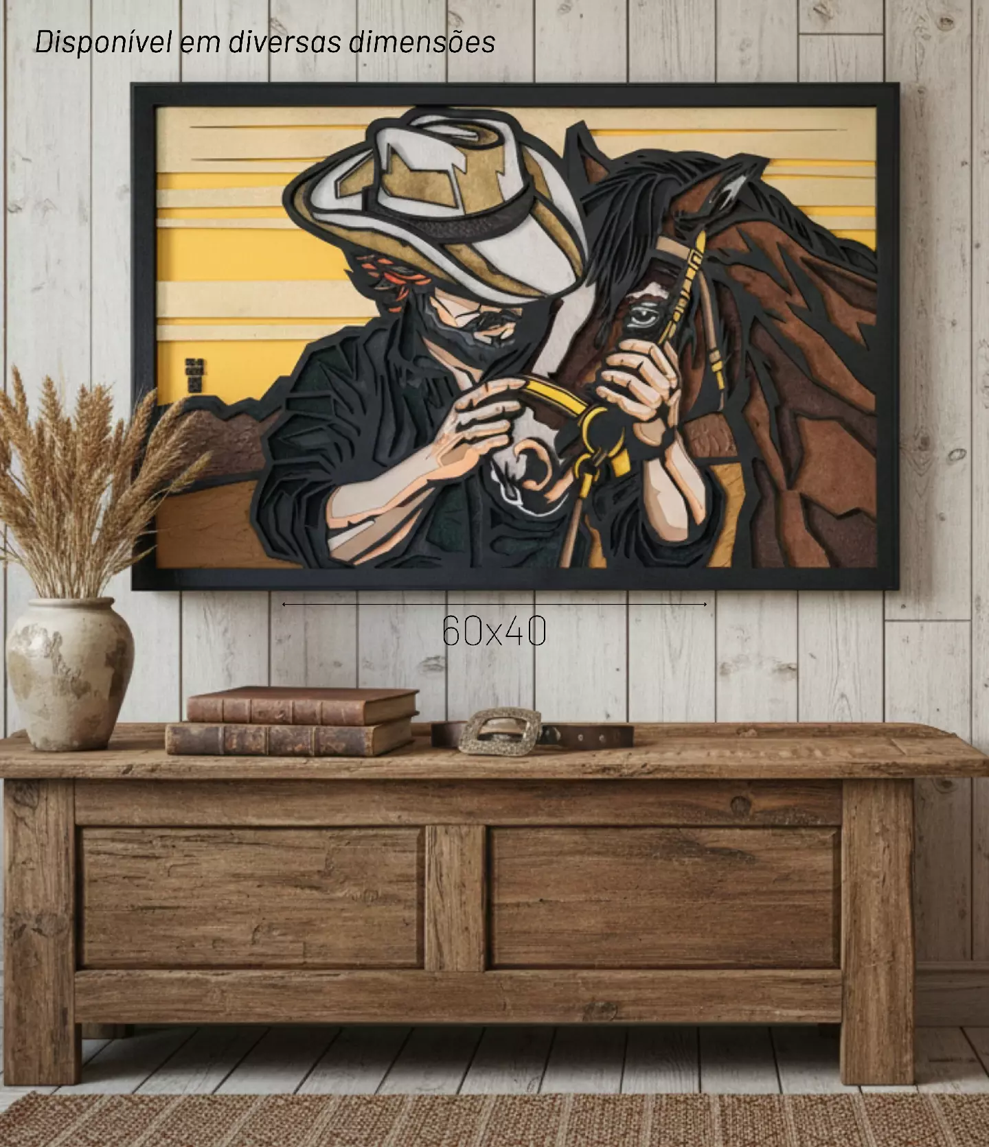 O fundo em tons de amarelo ecoa poeira e liberdade, enquanto a textura do couro e da madeira trazem o universo tátil do Oeste para o seu ambiente.