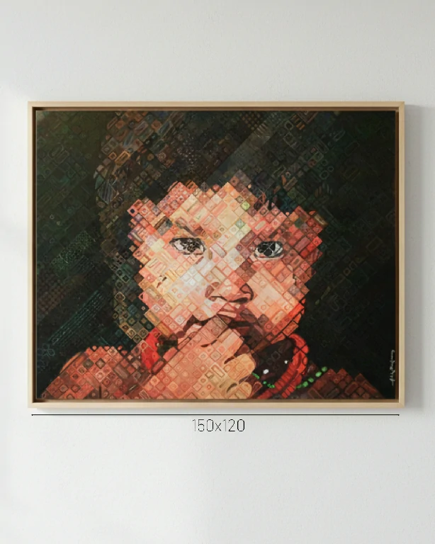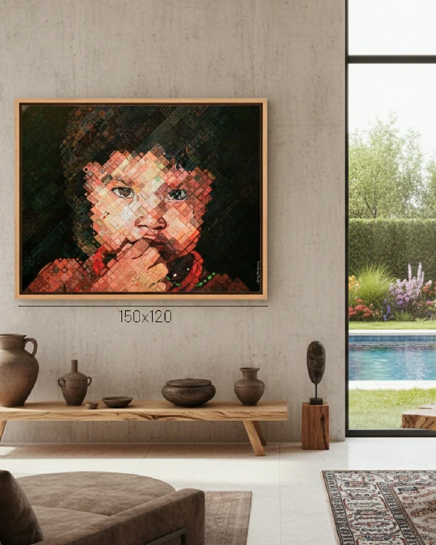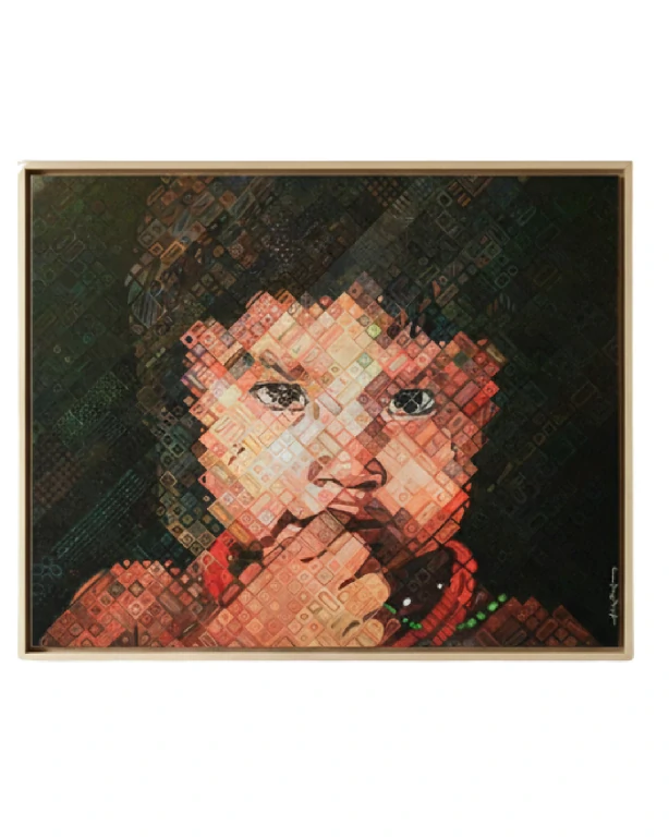 A obra é marcada pela técnica que lembra a pixelização ou a iconografia digital, onde o rosto é construído por inúmeros quadrados texturizados, criando um efeito visual fascinante de profundidade e abstração. O fundo escuro realça a luminosidade e a expressividade do olhar, enquanto as tonalidades de vermelho e marrom trazem calor e conexão com a terra.