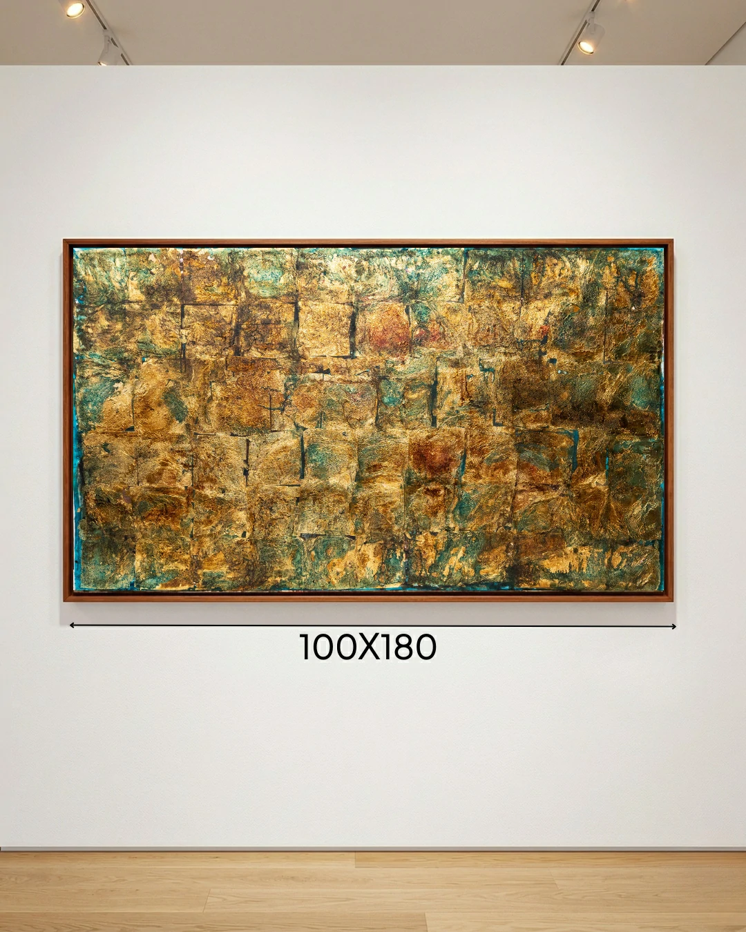 A obra “Dourado com Verde”, da artista Reco Marder, é uma verdadeira joia visual que redefine o conceito de luxo e textura na decoração contemporânea. Com suas generosas dimensões de 100×180, a tela se impõe no ambiente através de uma malha rítmica de tons metálicos que parecem pulsar conforme a incidência da luz. A sobreposição de folhas de ouro cria uma superfície tridimensional e orgânica, onde o brilho nobre é suavizado por oxidações e toques de verde profundo, remetendo a uma pátina histórica de valor inestimável.