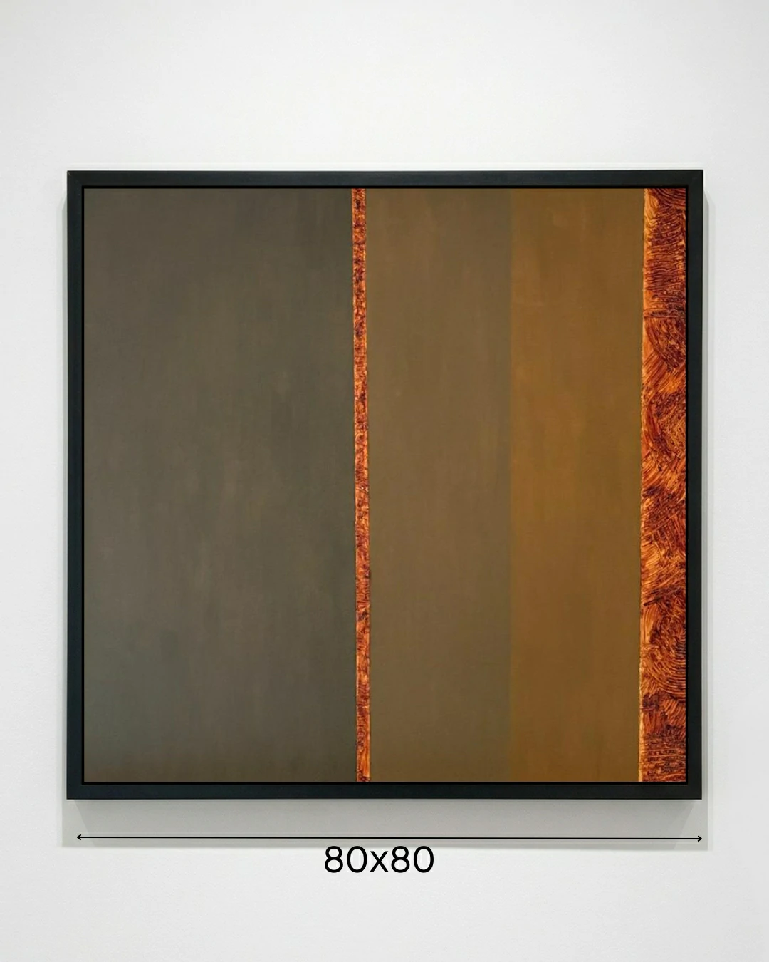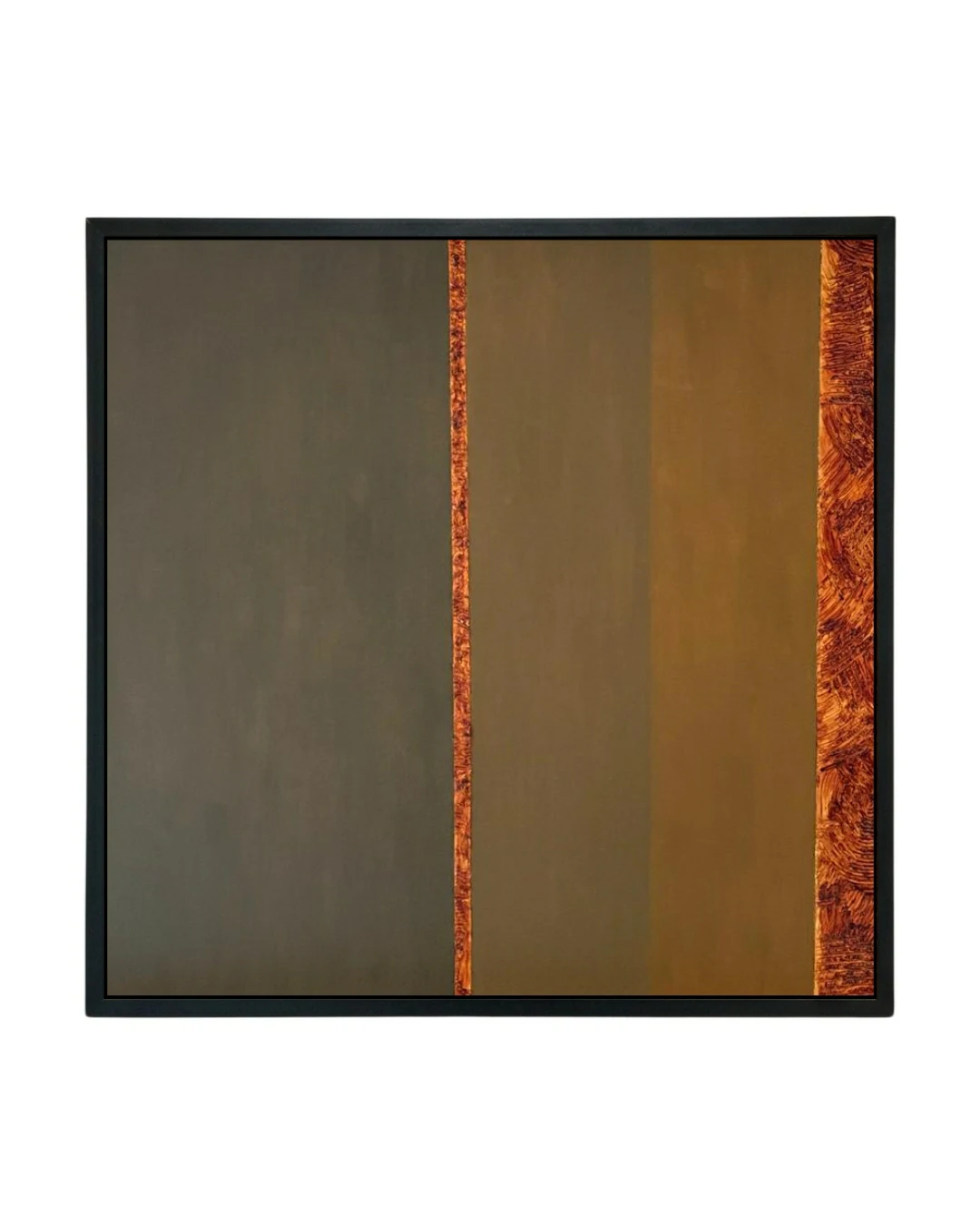Para o colecionador sofisticado, esta obra é um estudo de contraste e equilíbrio. A composição é um jogo de geometrias verticais, com faixas planas e de cores profundas (um cinza-concreto e um ocre-dourado) que trazem uma sensação de sobriedade e estrutura. Essas áreas calmas são interrompidas e pontuadas por listras verticais de uma textura rica, densa e visceral, em tons de laranja queimado e sienna. É aqui, nessas texturas táteis, que ecoa a sensibilidade do projeto fotográfico de Germano, “NUANCES OF NATURE”, traduzindo crostas minerais e detalhes orgânicos em pigmento.