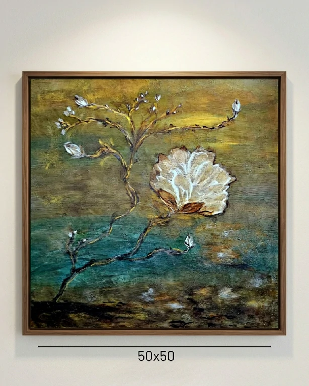 A escolha do nome “Encanto” sugere uma atmosfera mágica e cativante, que envolve o espectador e o transporta para um estado de serenidade e admiração. A repetição das quatro flores cria um ritmo visual que enfatiza a ideia de abundância e abundância espiritual.