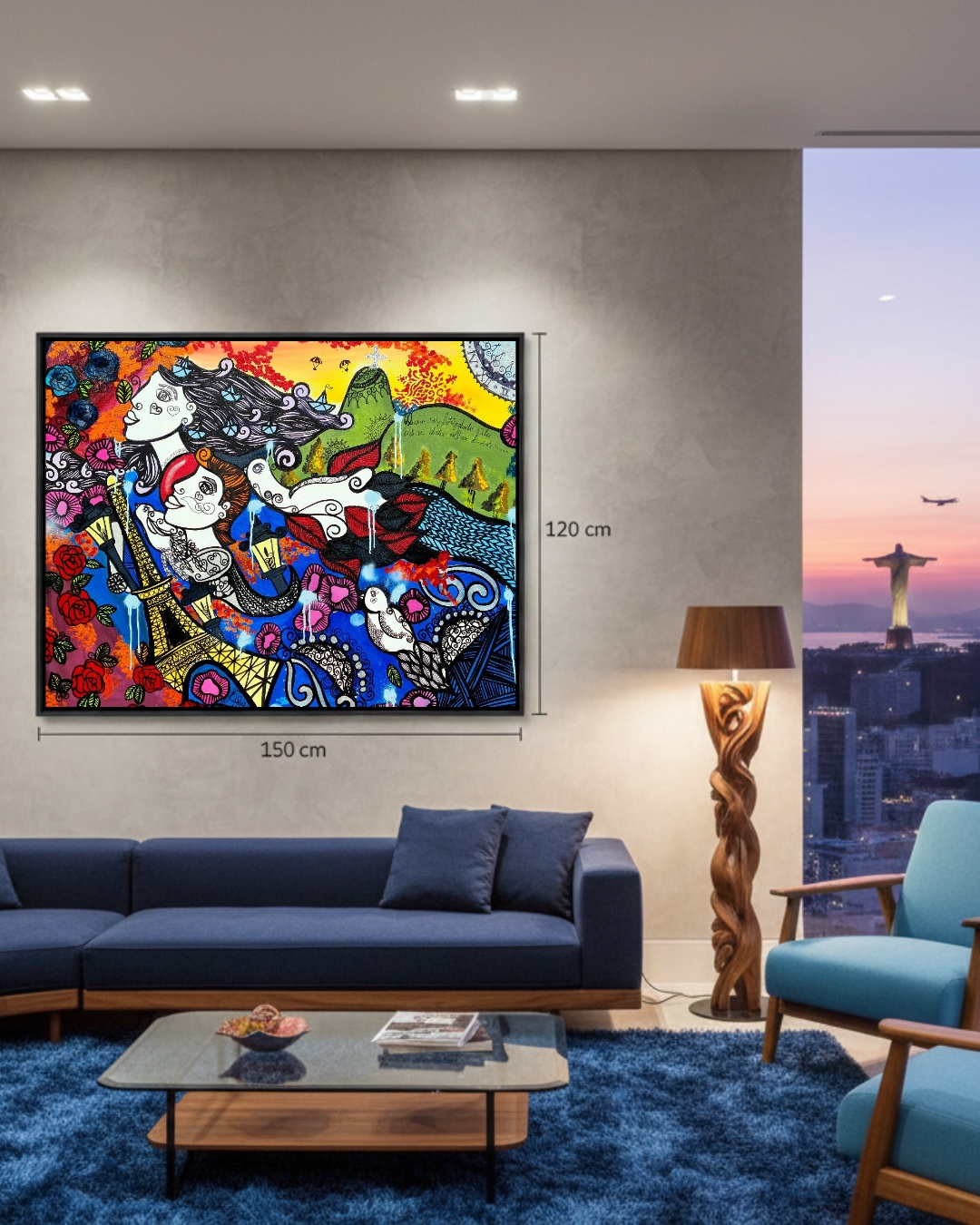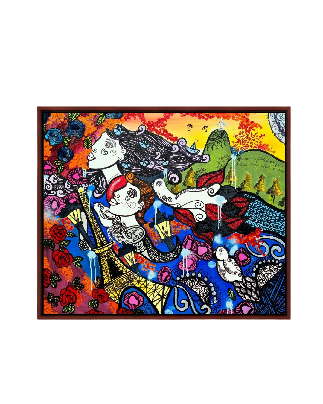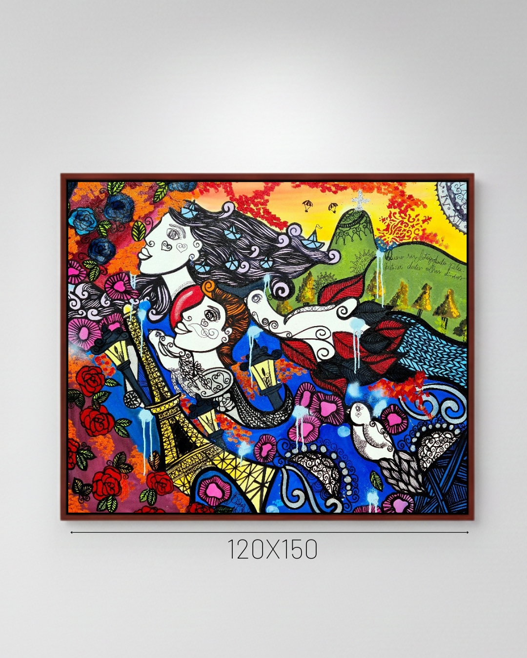 A composição é um diálogo magistral entre o icônico e o íntimo. De um lado, a Torre Eiffel evoca o romantismo europeu; do outro, o Cristo Redentor e o relevo do Rio de Janeiro trazem a alma solar brasileira. No centro, a interação entre as figuras e o fluxo de elementos — pássaros, flores e grafismos — sugere que o amor não conhece fronteiras físicas, existindo onde o olhar se encontra.