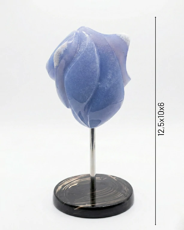 A Base como Contraste de Luxo: A sustentação em aço e Ônix oferece um contraponto sombrio e sólido à luminosidade da Calcedônia. O brilho profundo e negro do Ônix serve como um horizonte que ancora a peça, permitindo que o corpo principal da escultura pareça flutuar no espaço da galeria.