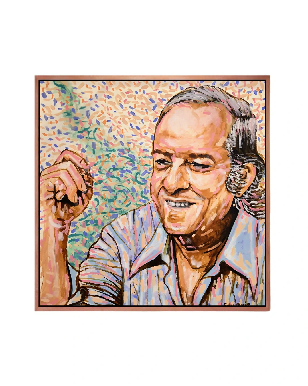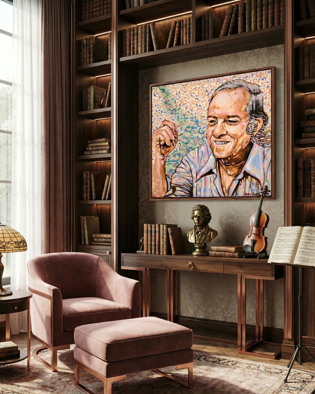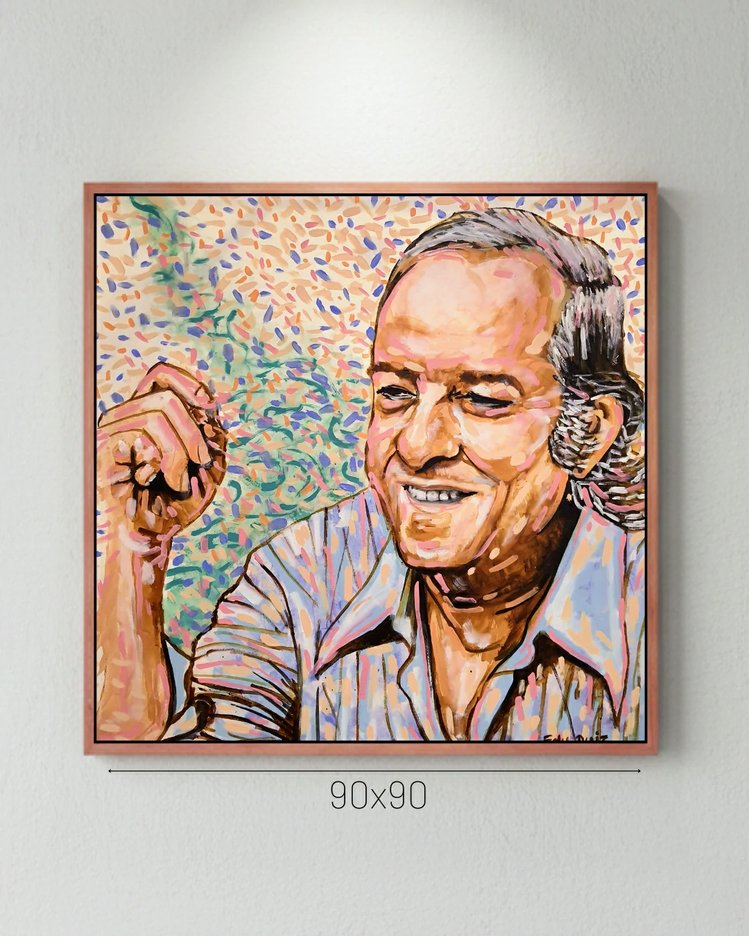 Sob a ótica comercial e decorativa, esta tela é um “Statement Piece” de imenso valor cultural e estético. Sua proporção quadrada permite uma versatilidade única em projetos de interiores, sendo o ponto focal ideal para salas de música, bibliotecas particulares ou livings que buscam uma atmosfera de sofisticação intelectual. A força do olhar e o sorriso sereno de Vinicius, emoldurados por um fundo dinâmico e pontilhista, conferem ao ambiente um vigor que estimula a conversa e a contemplação, transformando qualquer espaço comum em uma galeria de memórias e emoções.