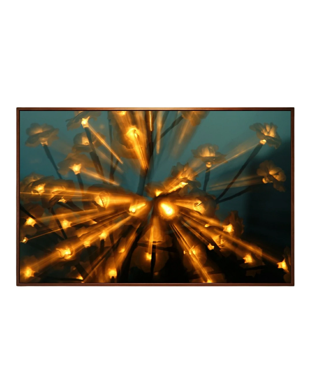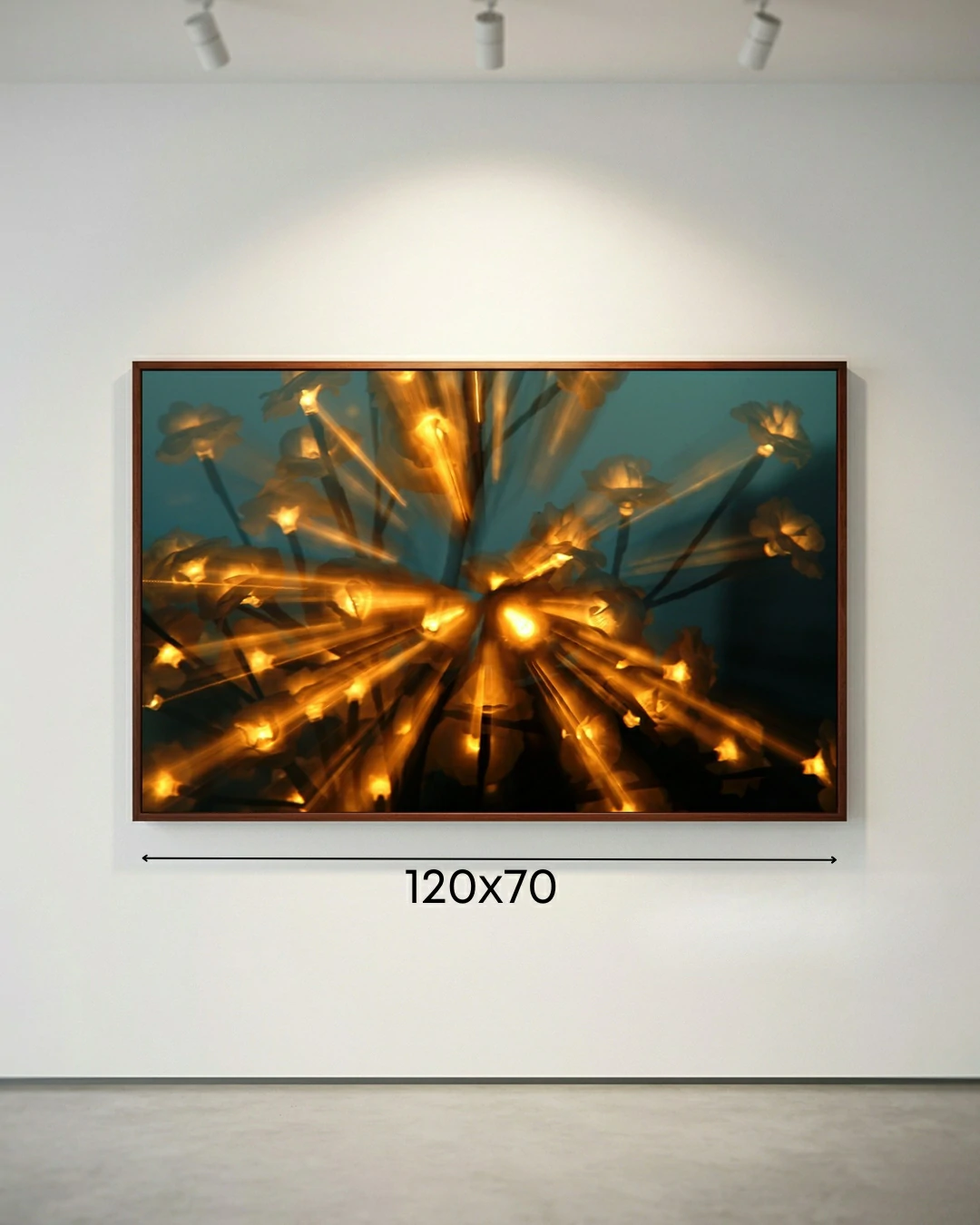 Em “Explosão em Dourado”, Ronaldo Camara nos oferece uma interpretação visual do momento da criação. O fundo em tons de azul-petróleo, mais claro e etéreo, serve como a tela perfeita para o desabrochar de uma força primordial. As fontes de luz dourada não apenas brilham; elas irradiam com uma intensidade que rompe a barreira do canvas. É um espetáculo de luz expansiva, onde cada feixe carrega a promessa de vida e energia. Uma obra monumental em 120×70, que preenche o ambiente com otimismo e calor.