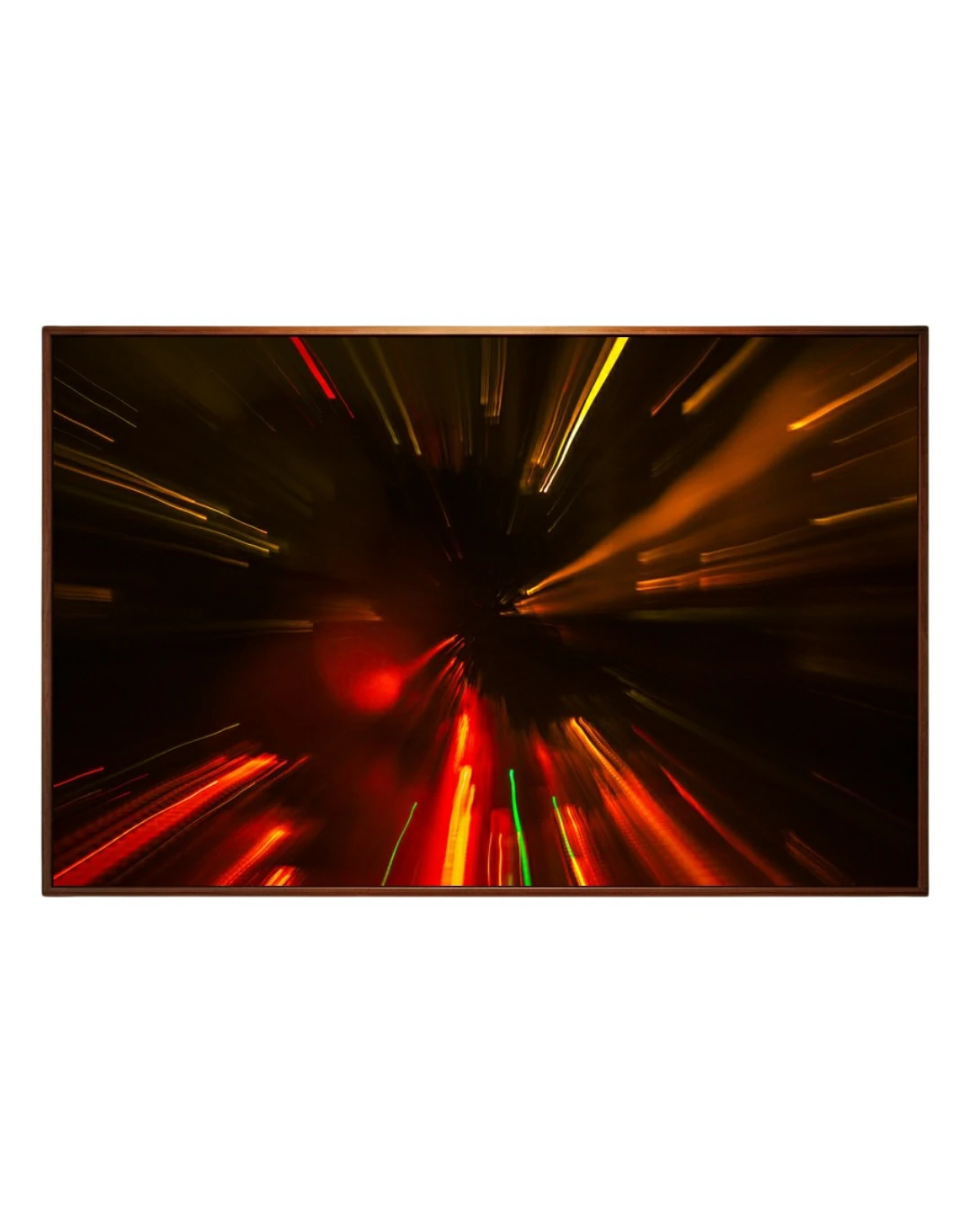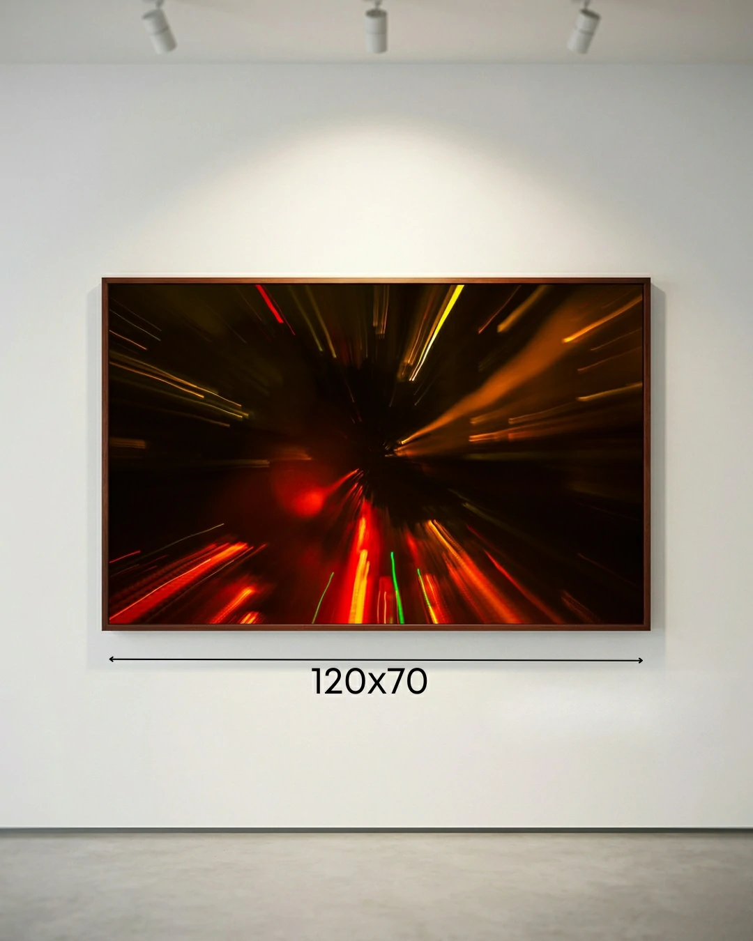Ronaldo Câmara nos convida a sentir a velocidade em “Explosão Universal”. O acabamento em canvas adiciona uma textura táctil que amplifica a riqueza das cores e a sensação de movimento. Esta peça captura um instante de intenso movimento, onde uma explosão policromática de luz se expande dramaticamente contra um céu preto profundo. A obra transmite uma sensação de calor, força e expansão, transformando qualquer ambiente em um ponto de irradiação de energia positiva e sofisticação artística, como um pulsar cósmico capturado em pleno fulgor.