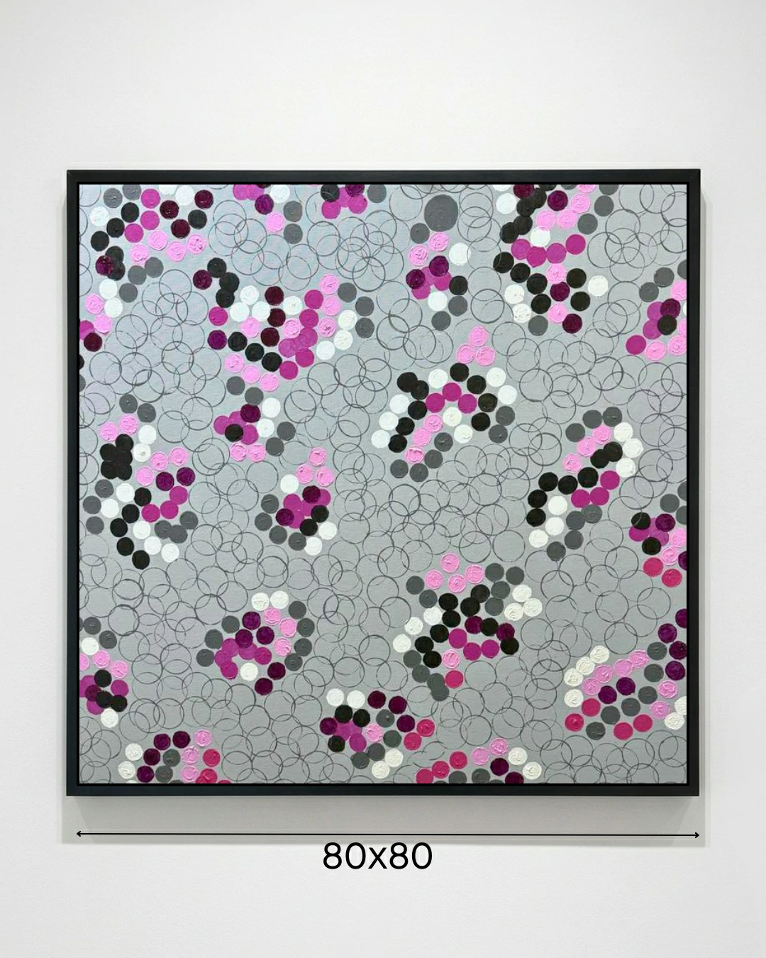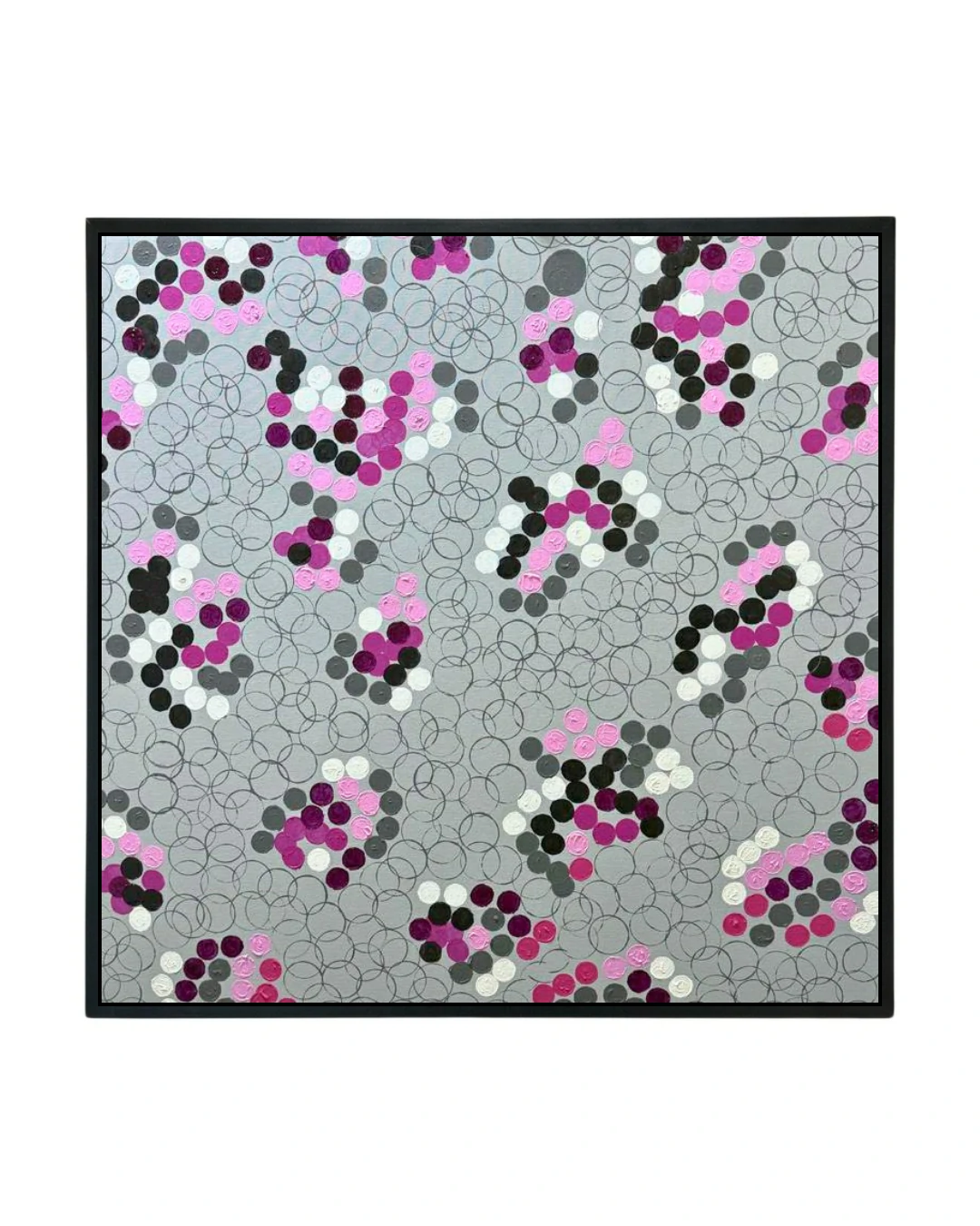 Topografia do Gesto: A tela é organizada através de aglomerados de círculos sólidos — em tons de fúcsia, magenta, preto, cinza e branco — que flutuam como ilhas sobre o plano de fundo. Essa repetição do ponto, aplicada com uma textura tátil perceptível, cria uma sensação de relevo e movimento orgânico.
