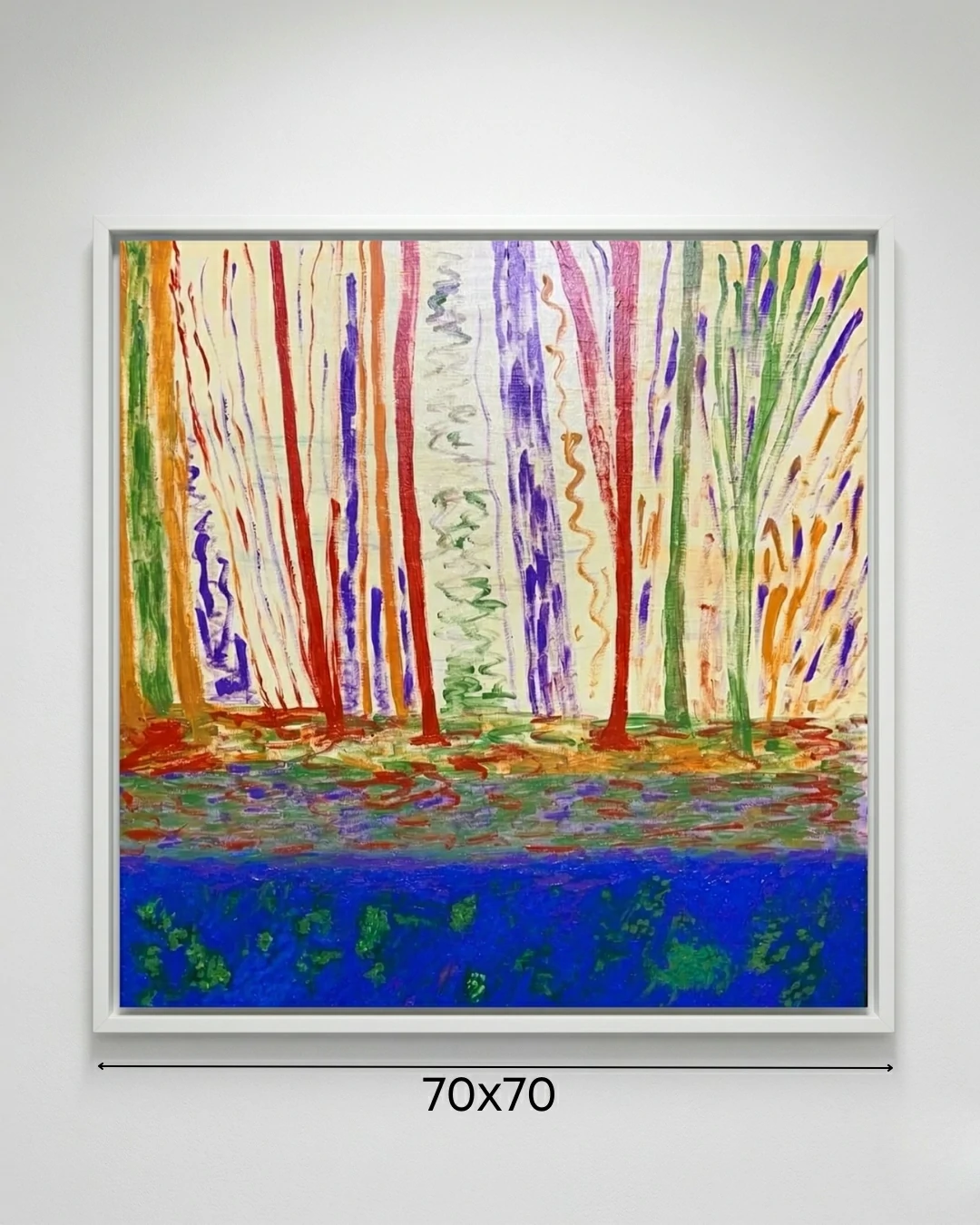 A tela Floresta Linhas Verticais, com suas dimensões de 70×70 cm e criada em 2022, é uma manifestação exemplar da linguagem artística de Buaiz. Nesta obra, a artista nos transporta para um bosque que é, ao mesmo tempo, natural e abstrato.