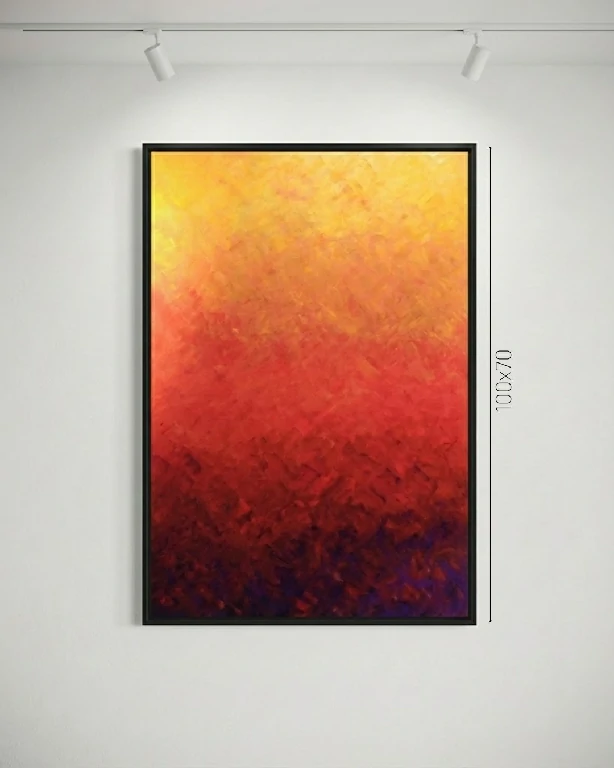 A composição se organiza em um campo onde vermelhos, alaranjados e dourados vibram no topo, mas perdem densidade à medida que descem, dissolvendo-se em um vazio tonal. Não há ruptura abrupta, mas uma transição quase orgânica: como se o próprio fogo cedesse lugar à memória de si. A superfície é construída com camadas alternadas de espátula, ora densas, ora translúcidas, criando um ritmo interno que pulsa em silêncio.