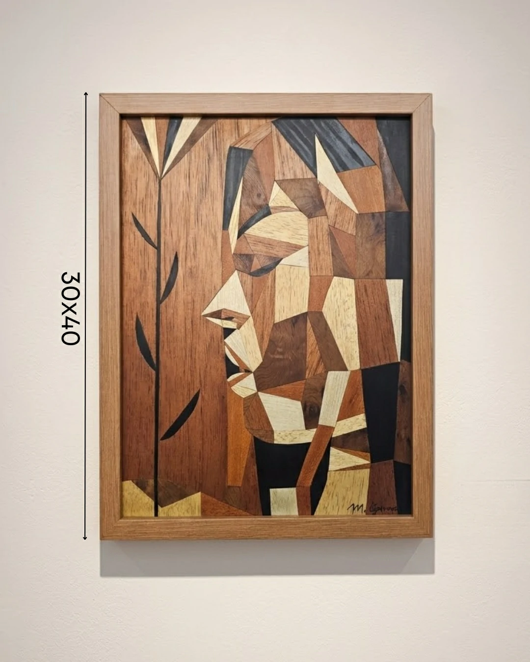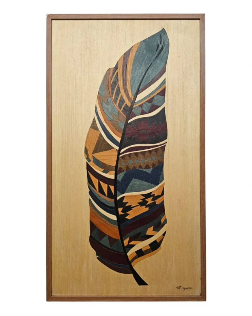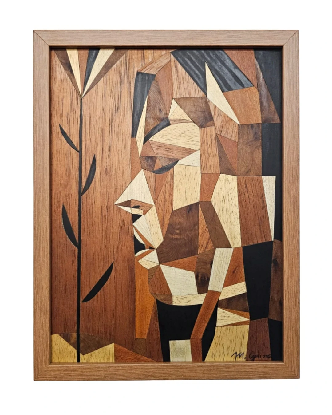 A obra “India Juana” (2021) é um dos exemplares mais expressivos da habilidade de Marcus Cyrino em capturar a profundidade da alma humana através da rigidez e, ao mesmo tempo, da calidez da madeira. Com dimensões de 40×30 cm, esta peça em marchetaria contemporânea utiliza lâminas de madeira de diversas origens para construir um retrato que exala dignidade, força e ancestralidade.