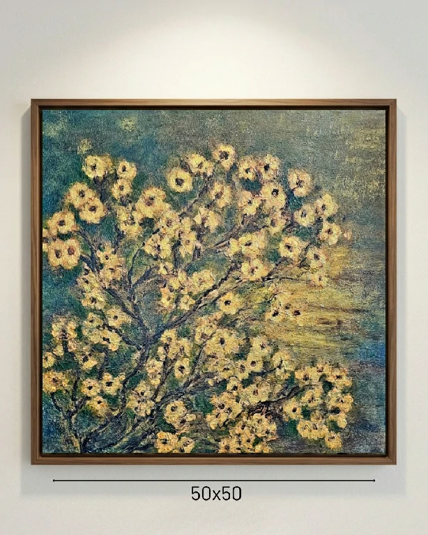 Luz e Sombra: A iluminação parece emanar das próprias flores, conferindo à obra uma aura quase mística. A aplicação da tinta em camadas cria pontos de luz que capturam o olhar do espectador, simulando o reflexo do sol entre as pétalas.