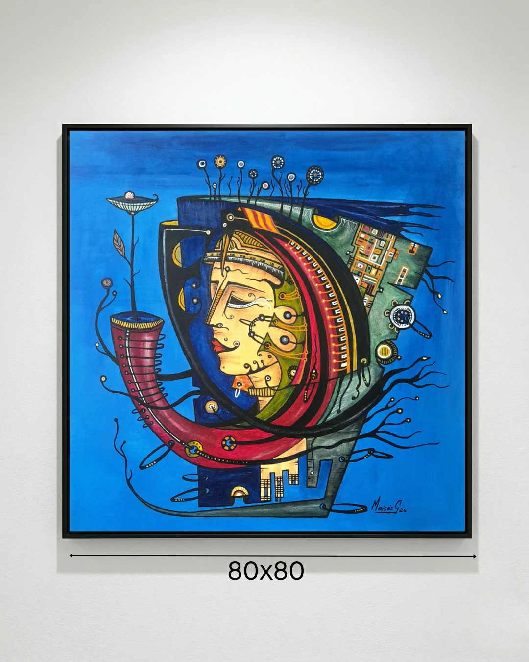 O uso do azul vibrante como pano de fundo evoca uma sensação de infinitude e paz, contrastando com o vermelho orgânico e o verde que remete à natureza e à renovação. A técnica de acrílico sobre lienzo permite a Acosta criar uma textura onde o mecânico e o botânico se fundem; as engrenagens da mente agora trabalham para sustentar a vida, e não mais para processar a dor do passado.