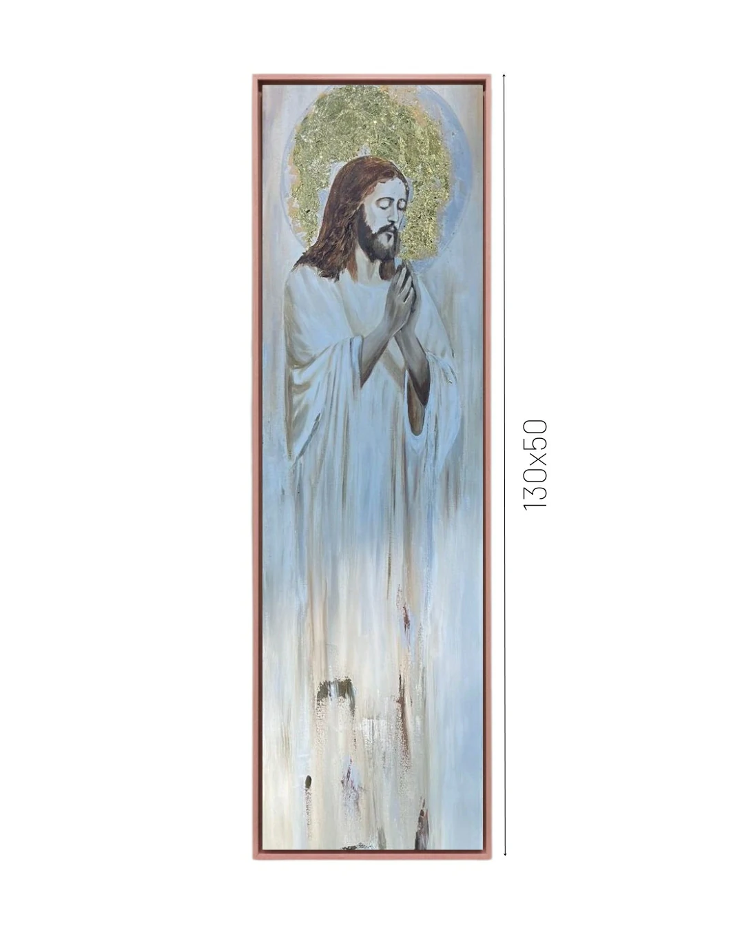 Na obra “Jesus Abençoando”, a artista Sintia Bogo utiliza a versatilidade da pintura acrílica para criar uma peça de grandes dimensões 130x50cm que domina o espaço com uma verticalidade proposital. O formato alongado não é apenas uma escolha estética, mas uma alusão à ascensão e à conexão entre o terreno e o divino.