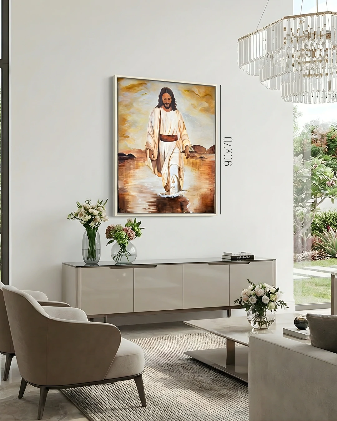 “Jesus nas Águas” não é apenas uma representação histórica, mas uma metáfora visual sobre a superação de tempestades e a confiança. O rosto de Cristo, mantido em uma expressão de serenidade inabalável, serve como um ponto de ancoragem para quem observa a obra, transmitindo segurança e paz em meio à vastidão dos elementos naturais.