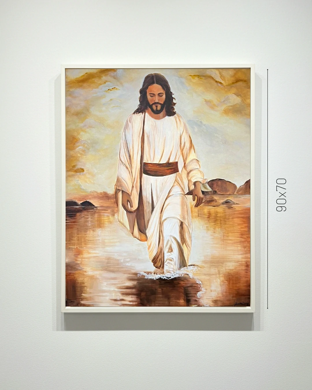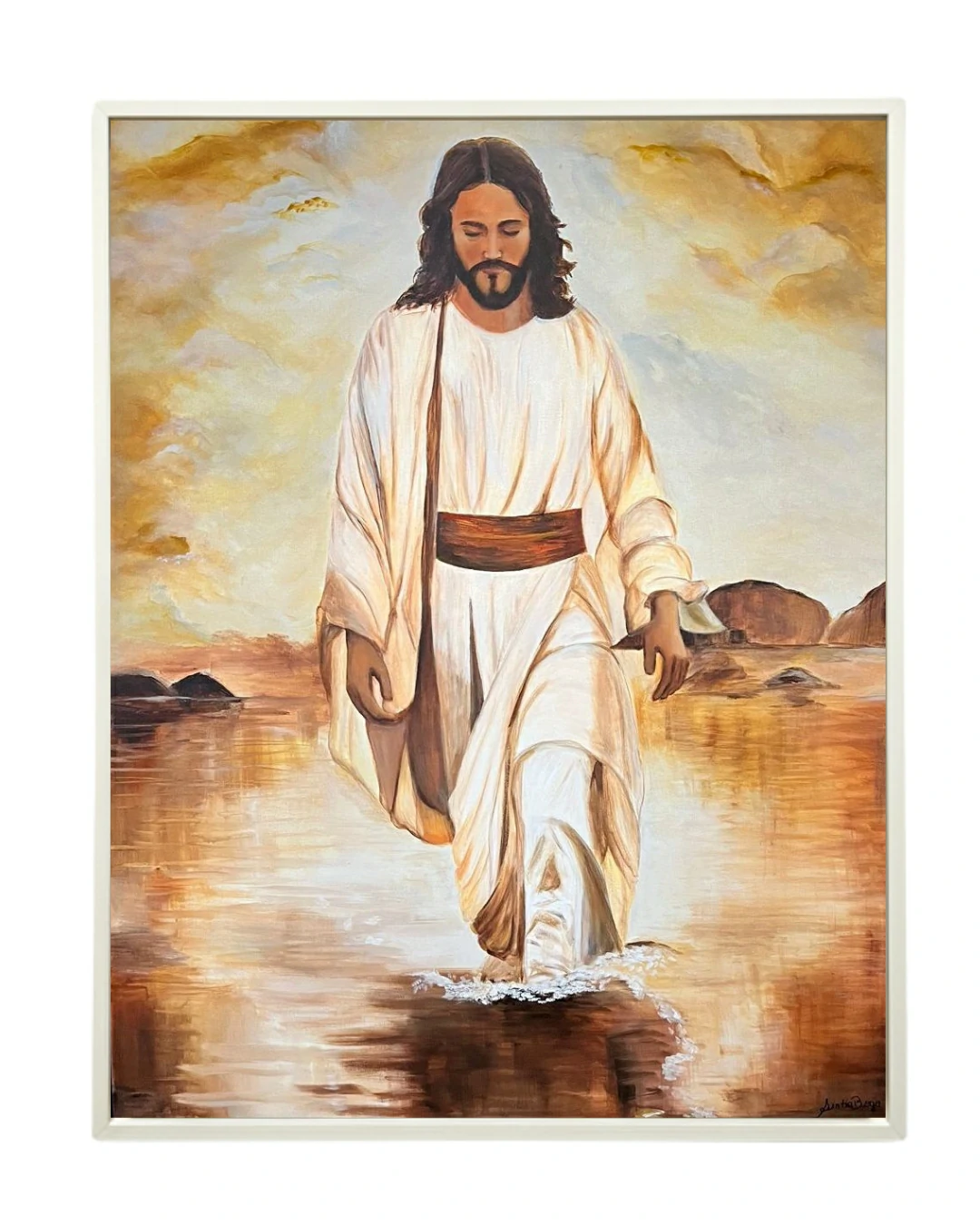 A execução em acrílico permite que a artista trabalhe as dobras do manto com fluidez, transmitindo a leveza do tecido ao vento. O detalhe técnico mais impressionante reside na base da pintura: o leve “borrifo” de branco onde os pés tocam a superfície líquida. Esse detalhe minimalista é o que define o milagre, transformando a água em um caminho sólido sob os pés da fé.
