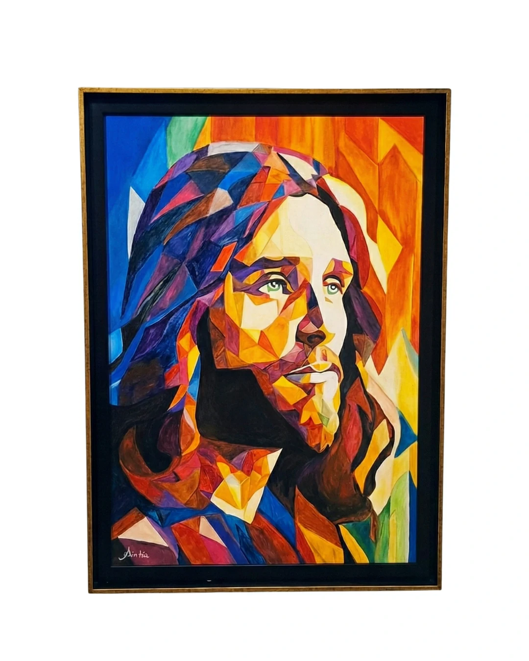 Na obra “Jesus Pop Art” ($0,50 \times 0,70$ m), Sintia Bogo subverte a sobriedade tradicional das imagens religiosas para abraçar a estética da Pop Art e do Cubismo Geométrico. A pintura em acrílico é construída através de planos fragmentados e facetas de cor pura, que em conjunto revelam um rosto de Cristo dinâmico e multifacetado.