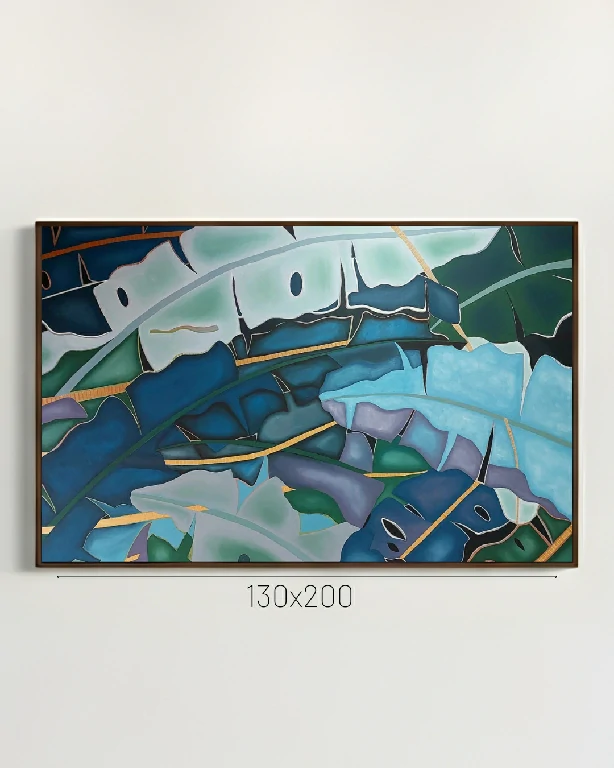 Profundidade Cromática: A paleta transita entre o azul profundo, o turquesa e verdes musgo, criando uma sensação de sombra e frescor. O uso de tons mais claros, quase etéreos, nas bordas das formas, confere uma qualidade luminescente à obra.
