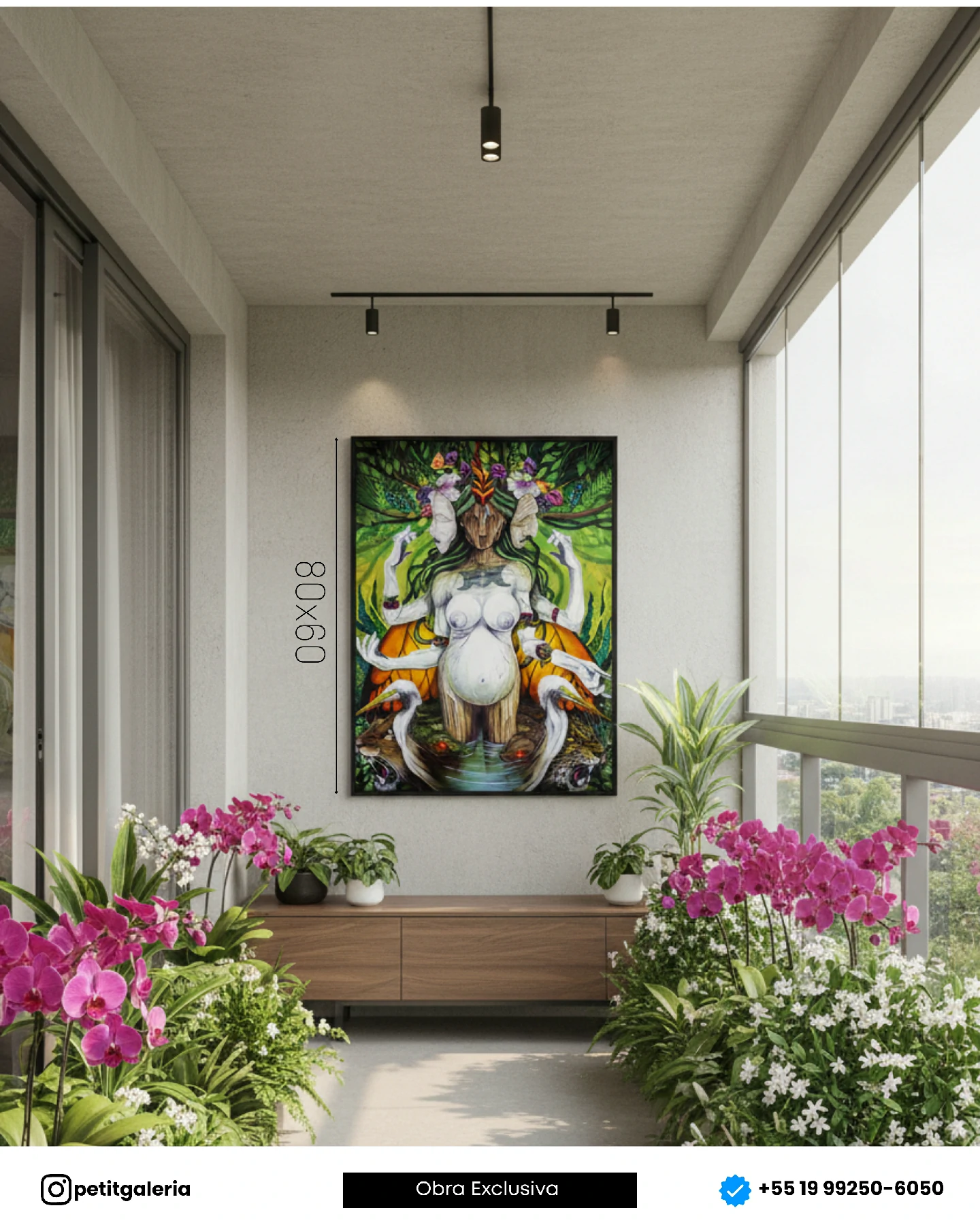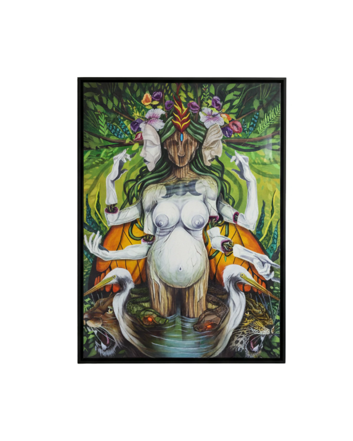 Esta é uma tela que irradia energia mística e poética. “MÃE NATUREZA” é ideal para quem deseja adicionar um toque de poder feminino, mistério e a exuberância da floresta tropical à sua coleção, através do olhar único de Will Ferreira.