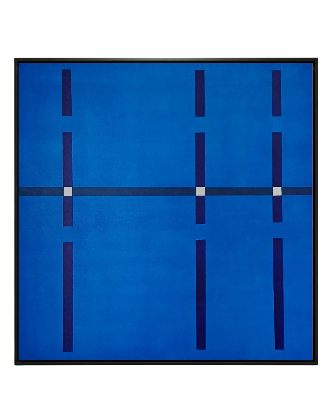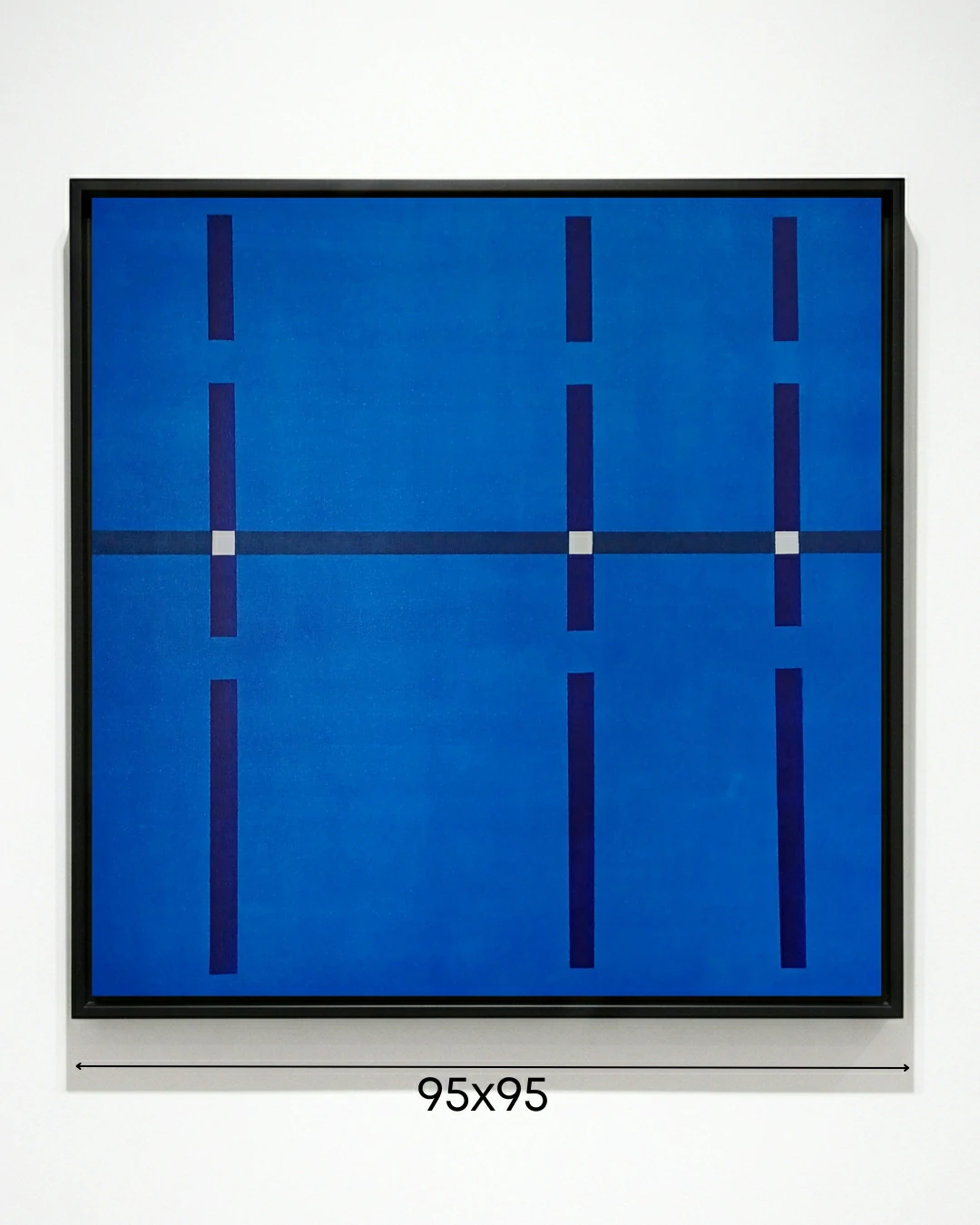 Nesta obra de Marcelus Freschet, uma acrílica sobre tela de 95 cm x 95 cm, a precisão do arquiteto e o olhar do designer se encontram em um campo de azul vibrante e profundo. A composição é estruturada por uma grade ortogonal que remete ao planejamento urbano ou a diagramas estruturais, reafirmando sua habilidade em criar “paisagens imaginárias geométricas”. O uso rítmico das linhas escuras, pontuadas por pequenos quadrados brancos nos eixos de intersecção, cria uma sensação de ordem e equilíbrio, transformando a tela em um estudo sobre proporção e harmonia contemporânea.