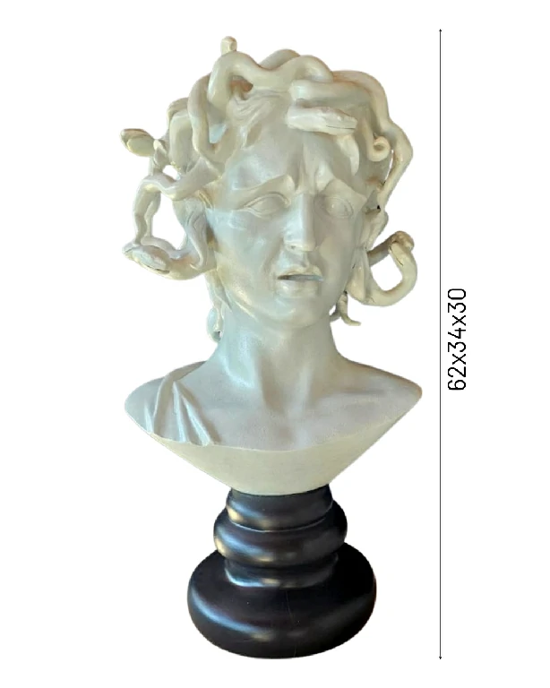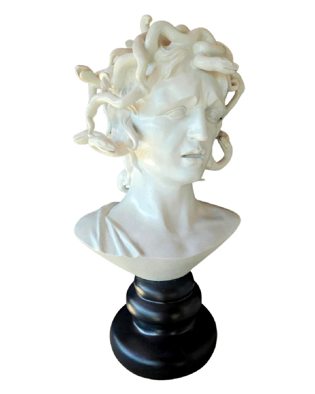 Dinâmica das Formas: O emaranhado de serpentes que compõe a cabeleira da Medusa demonstra o domínio técnico do artista sobre o movimento. Cada curva e sobreposição foi cuidadosamente modelada para criar um jogo de luz e sombra (o chiaroscuro tridimensional) que confere vida e inquietude à escultura.
