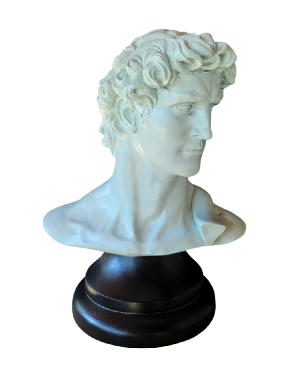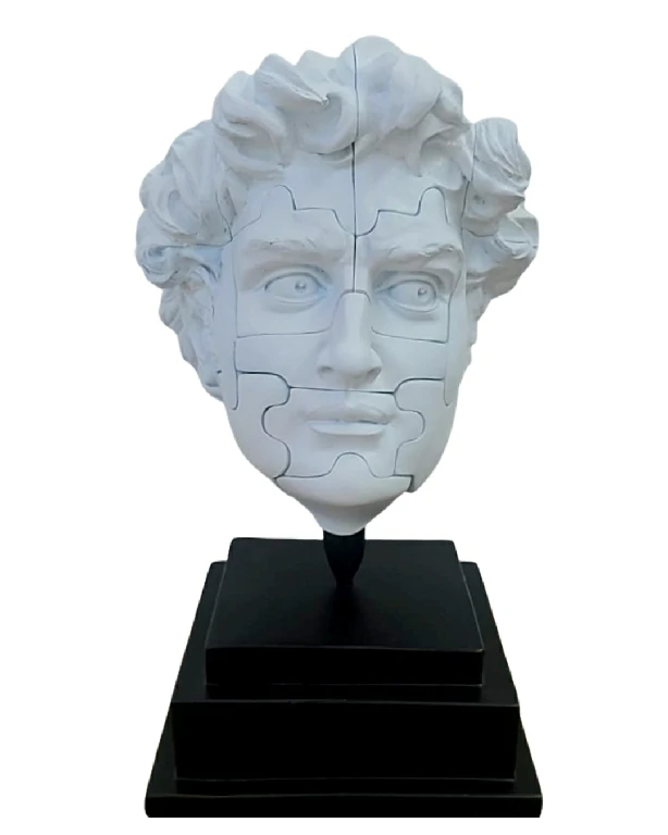 Materialidade e Acabamento: A escolha da resina, finalizada com pintura acrílica de tom ebúrneo, confere à obra uma aura de antiguidade clássica, ao mesmo tempo que garante uma durabilidade e leveza impossíveis de alcançar com os métodos tradicionais de mármore ou bronze.