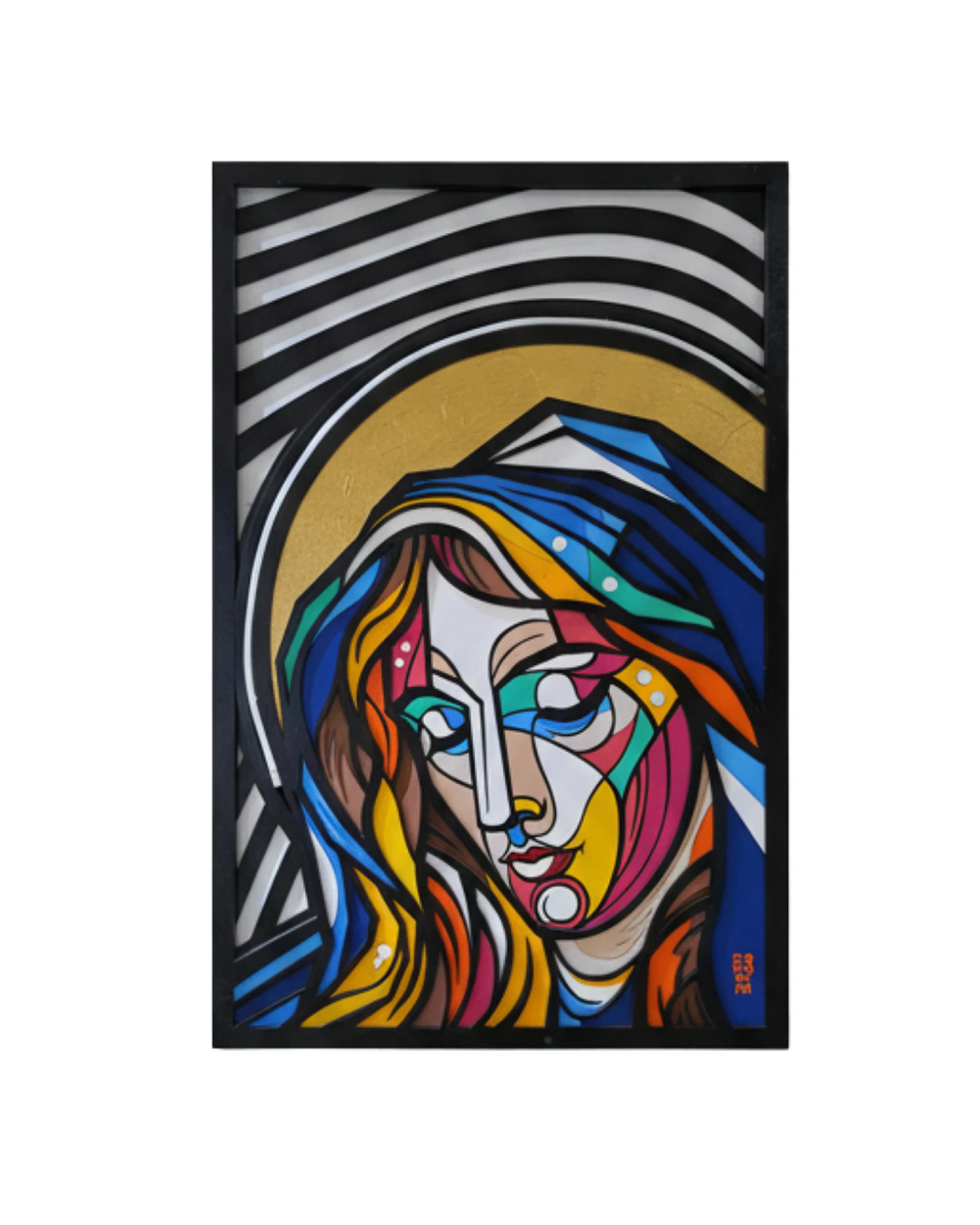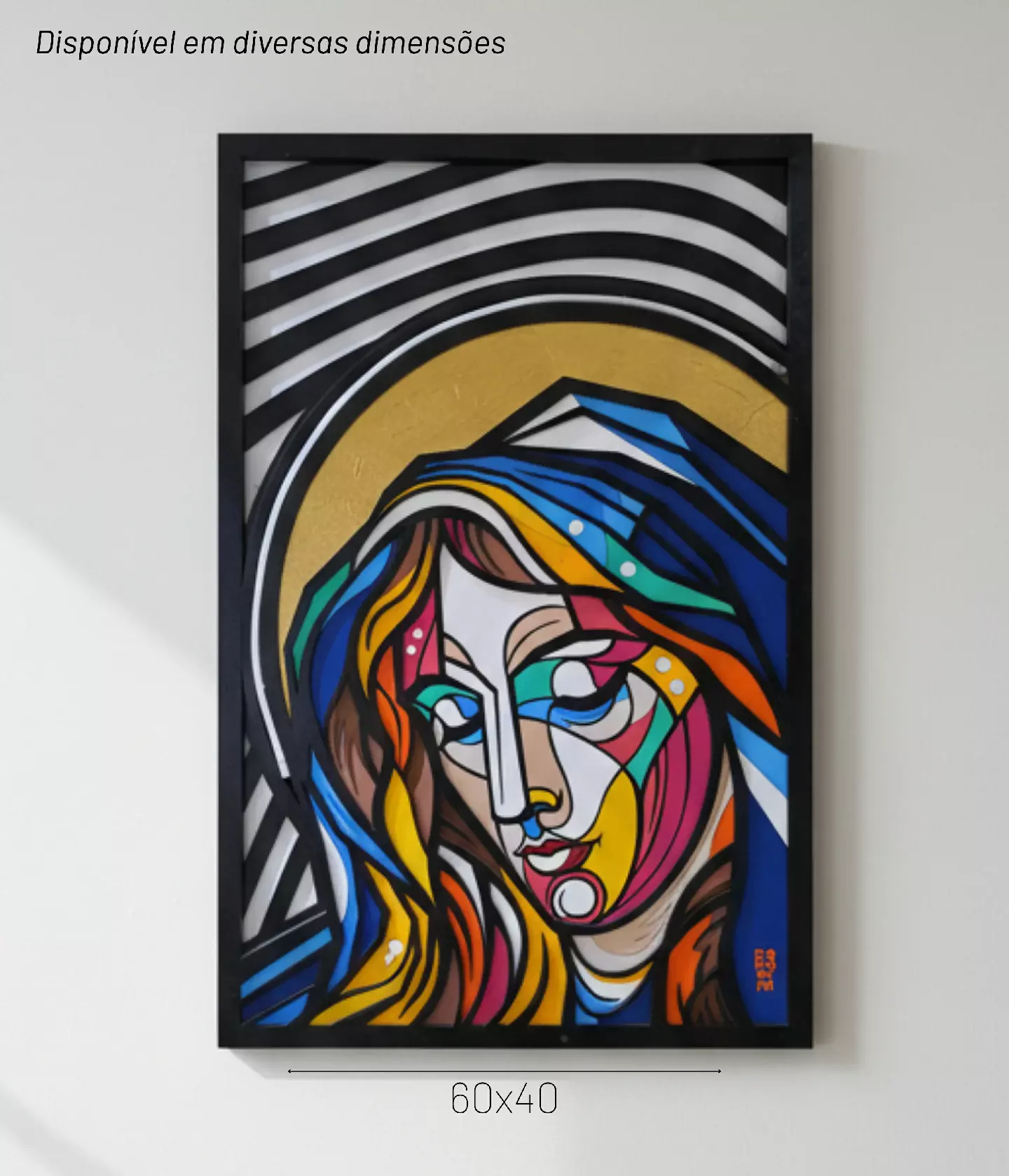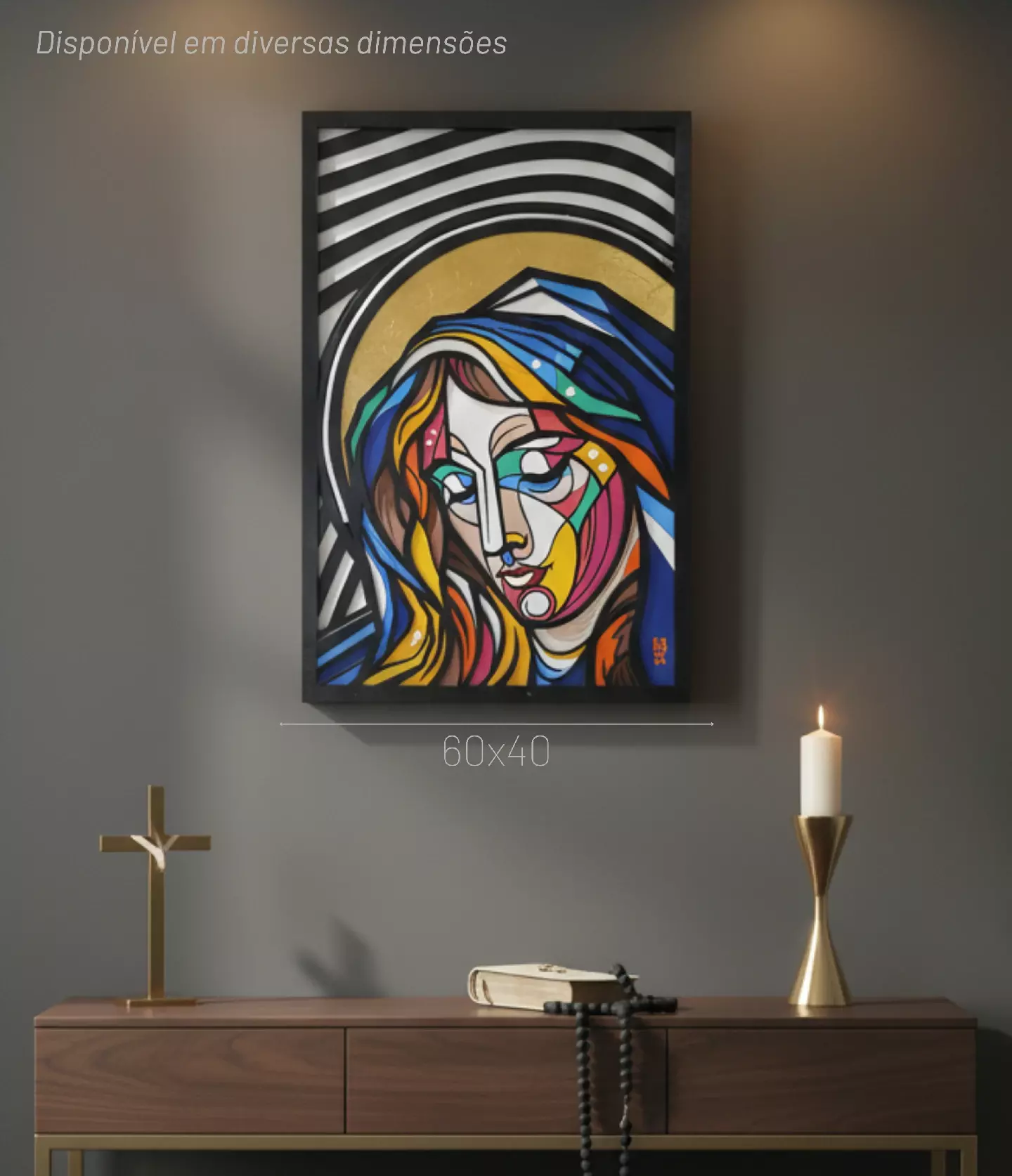 O olhar sereno da Virgem, envolto por traços que lembram vitrais modernos e uma aura dourada, ganha vida própria. É uma obra que ilumina o ambiente e a alma.