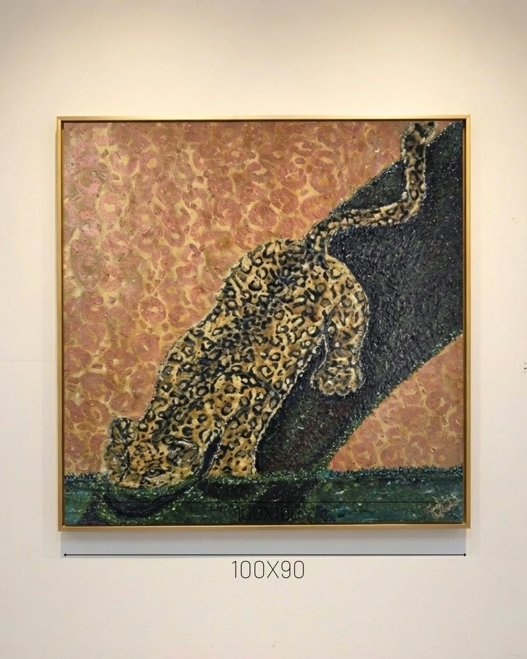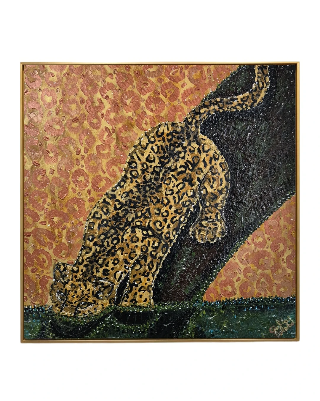 Dualidade do Padrão: A artista utiliza um recurso metalinguístico fascinante ao espelhar as rosetas da pele da onça em um fundo de tons terrosos e acobreados. Essa escolha cria um efeito de camuflagem que desafia a percepção, sugerindo que o animal e o ambiente são uma extensão um do outro.
