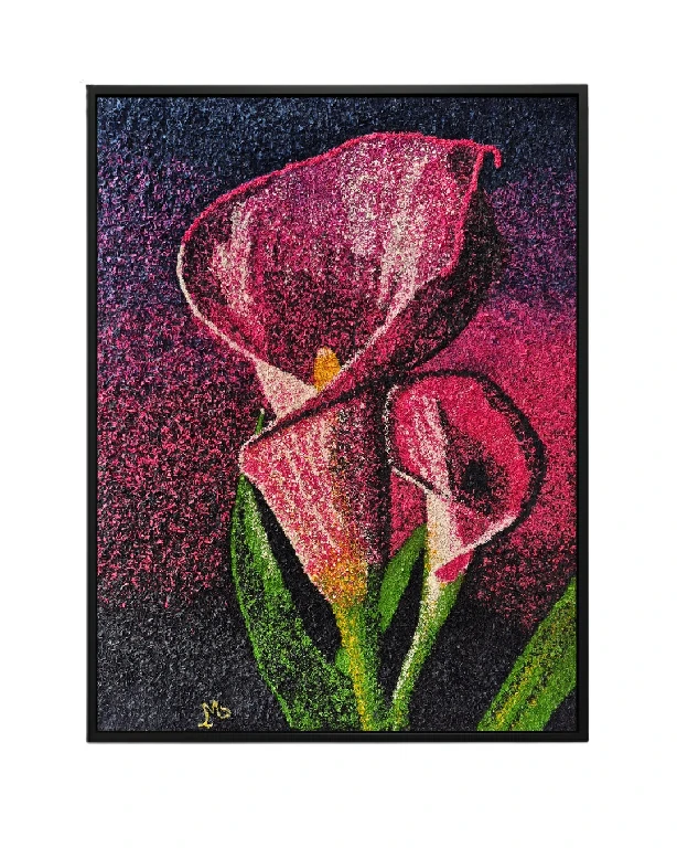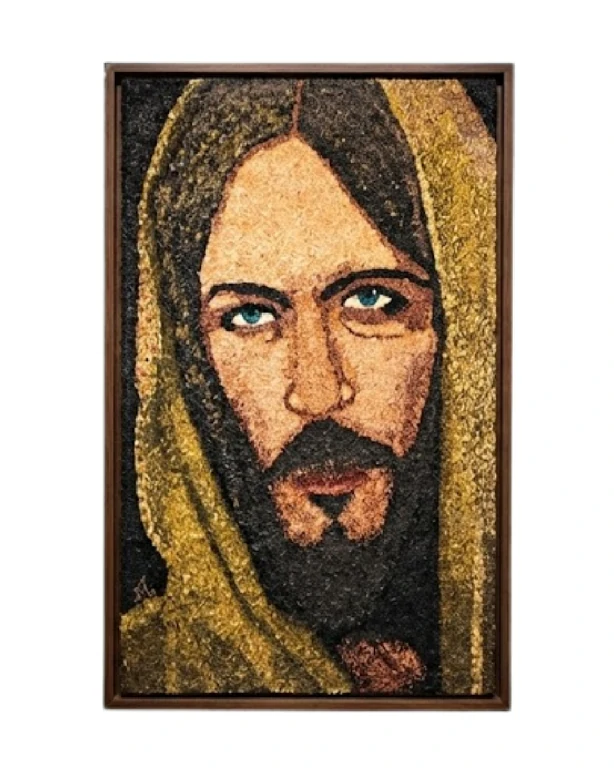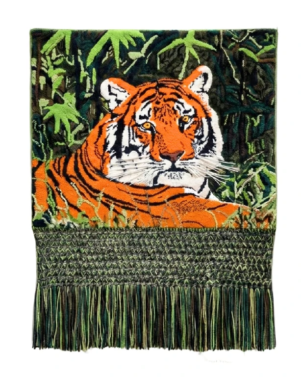 Na tapeçaria “Onça Pintada”, Marcia Peixoto utiliza a tradicional técnica Smirna para capturar a essência vibrante e o olhar penetrante de um dos maiores símbolos da biodiversidade brasileira. Com 1,50m de comprimento, a obra estabelece uma presença imponente, onde a arte têxtil se funde com a representação realista da natureza.