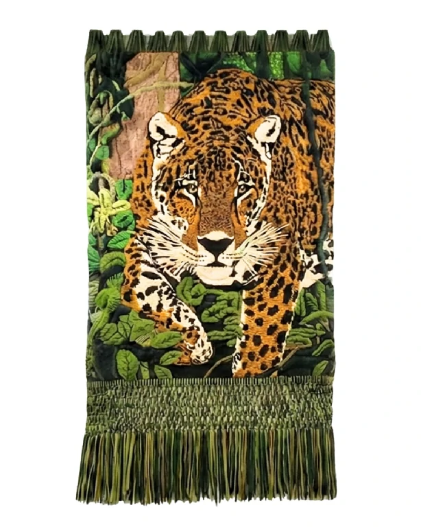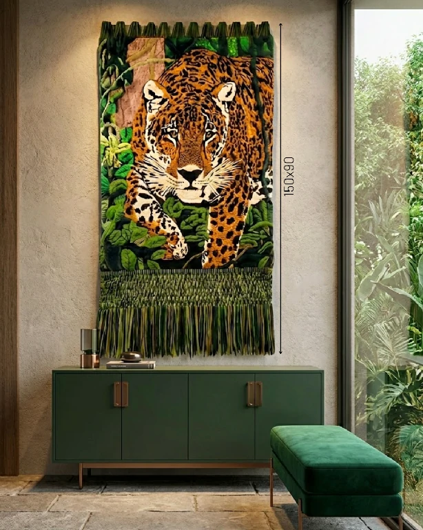 Composição Cromática: O contraste entre as manchas icônicas da onça e a exuberância da folhagem verde ao fundo demonstra um controle técnico refinado sobre a paleta de cores têxtil.