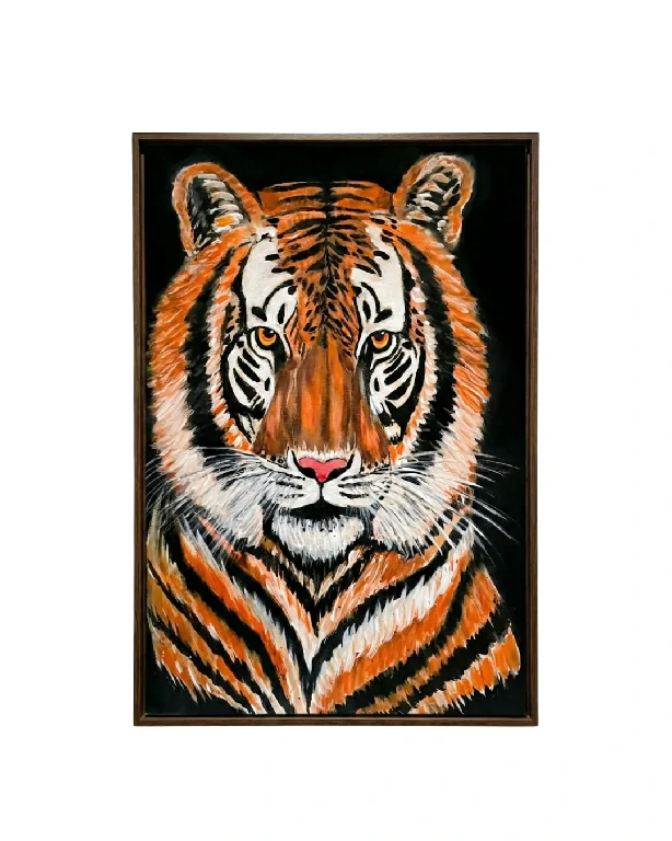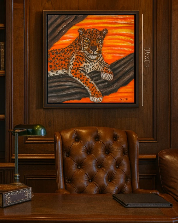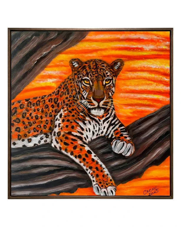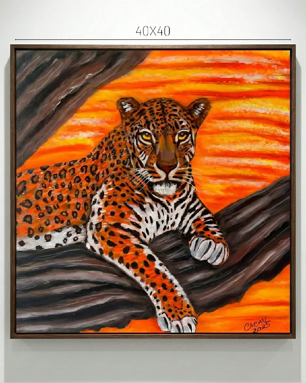 Apresentamos uma peça de alta energia e impacto visual que celebra a rainha da fauna brasileira: a Onça Pintada. Nesta tela, o artista CACAU captura a beleza e a intensidade deste felino icônico em um cenário de pôr do sol ardente.