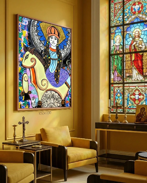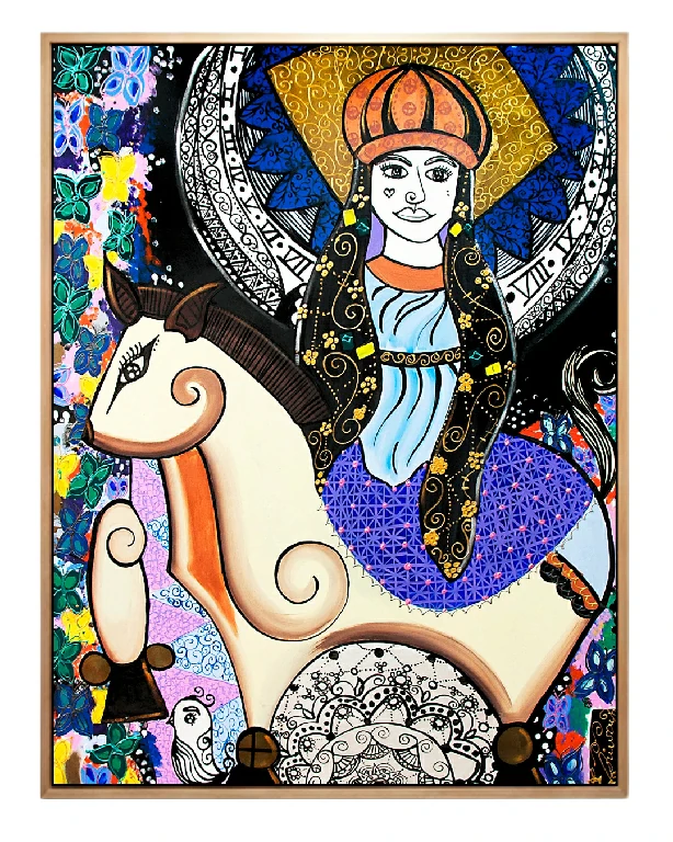 A peça centraliza uma figura feminina arquetípica, montada em um cavalo que evoca tanto a nobreza quanto a jornada espiritual. A estética do “Cordel Moderno” é evidente nas linhas pretas marcantes, que remetem à xilogravura tradicional, mas que aqui ganham frescor e vida através de uma paleta vibrante de azuis profundos, dourados e ornamentos meticulosos.