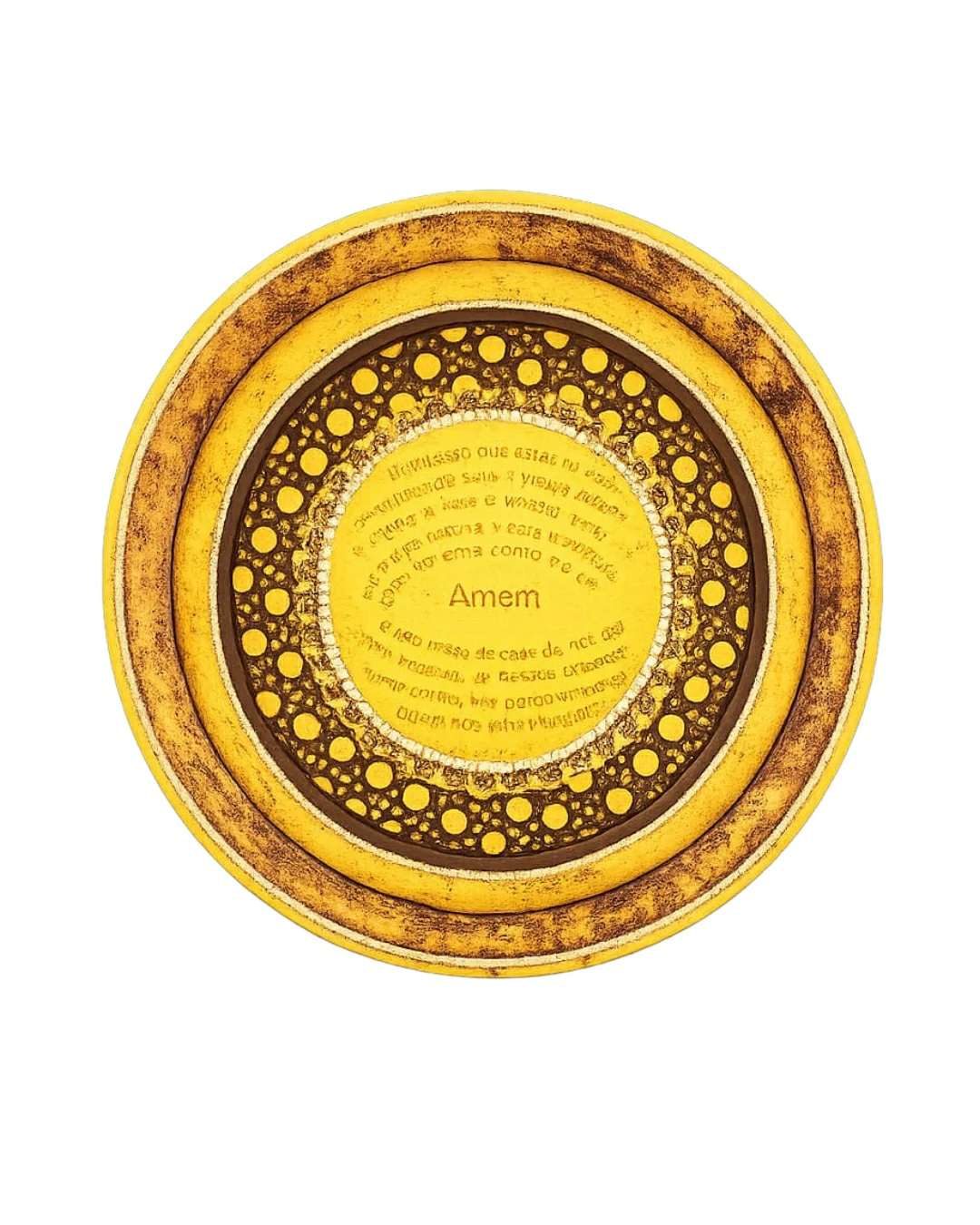 O texto da prece é aplicado de forma que parece gravado no metal, com o “Amém” centralizado para finalizar a leitura de forma harmônica.