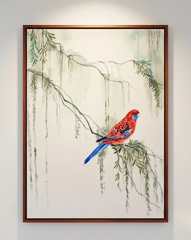 Nesta composição horizontal de impacto, Vânia Coelho reafirma seu lugar como uma das principais vozes da arte botânica e naturalista contemporânea no Brasil. A obra Papagaio Rosela Carmesim é um estudo de contraste e equilíbrio, onde o vibrante carmesim da ave se destaca contra a suavidade etérea da vegetação em tons de sálvia e ocre.