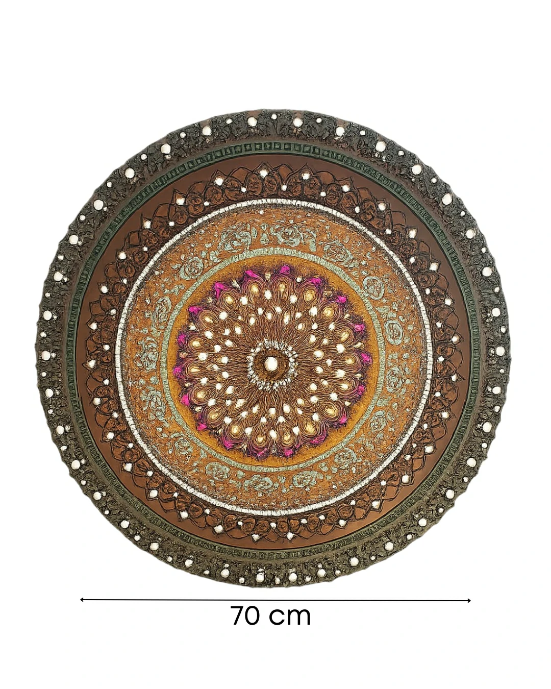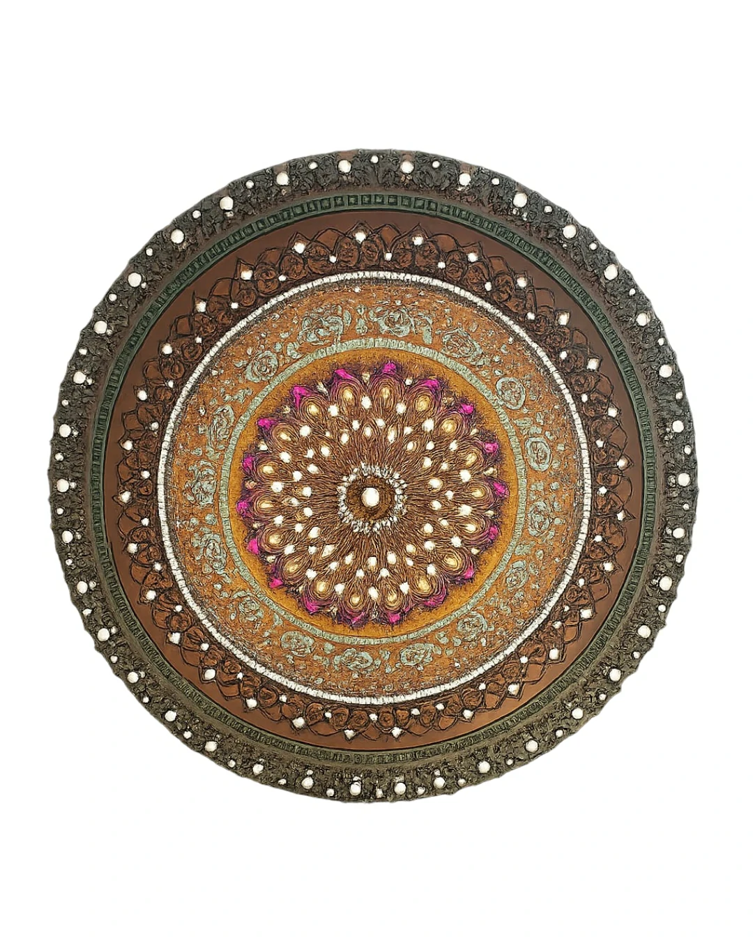 Diferente das mandalas puramente metálicas, a “Pavão” introduz tons de magenta e púrpuras profundos no centro, que contrastam com fundos acobreados e detalhes em pátina esverdeada. Essa escolha cromática evoca a plumagem da ave, simbolizando imortalidade, renovação e a beleza que se revela em sua plenitude.