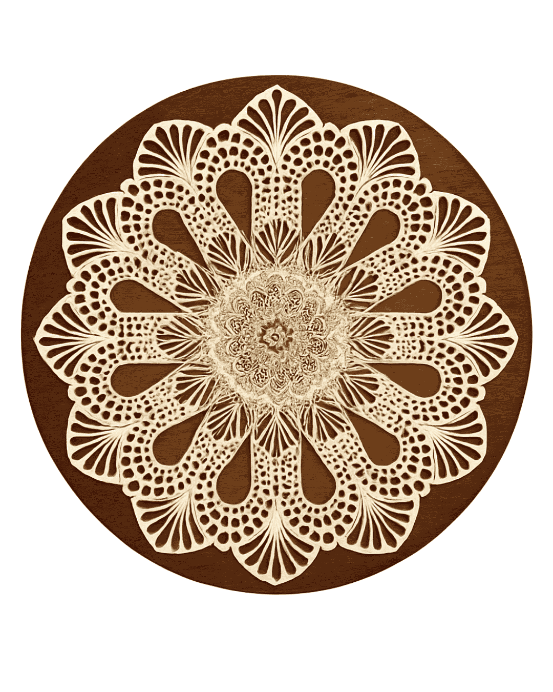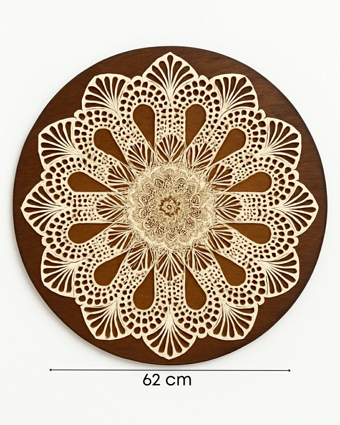 O uso da madeira nobre como base é o grande diferencial desta mandala. A textura natural e o tom profundo da madeira servem como um “palco” para o design vazado, criando um jogo de luz e sombra (chiaroscuro) que dá uma profundidade real à peça. A madeira traz um elemento de solidez e luxo natural que ancora toda a composição.