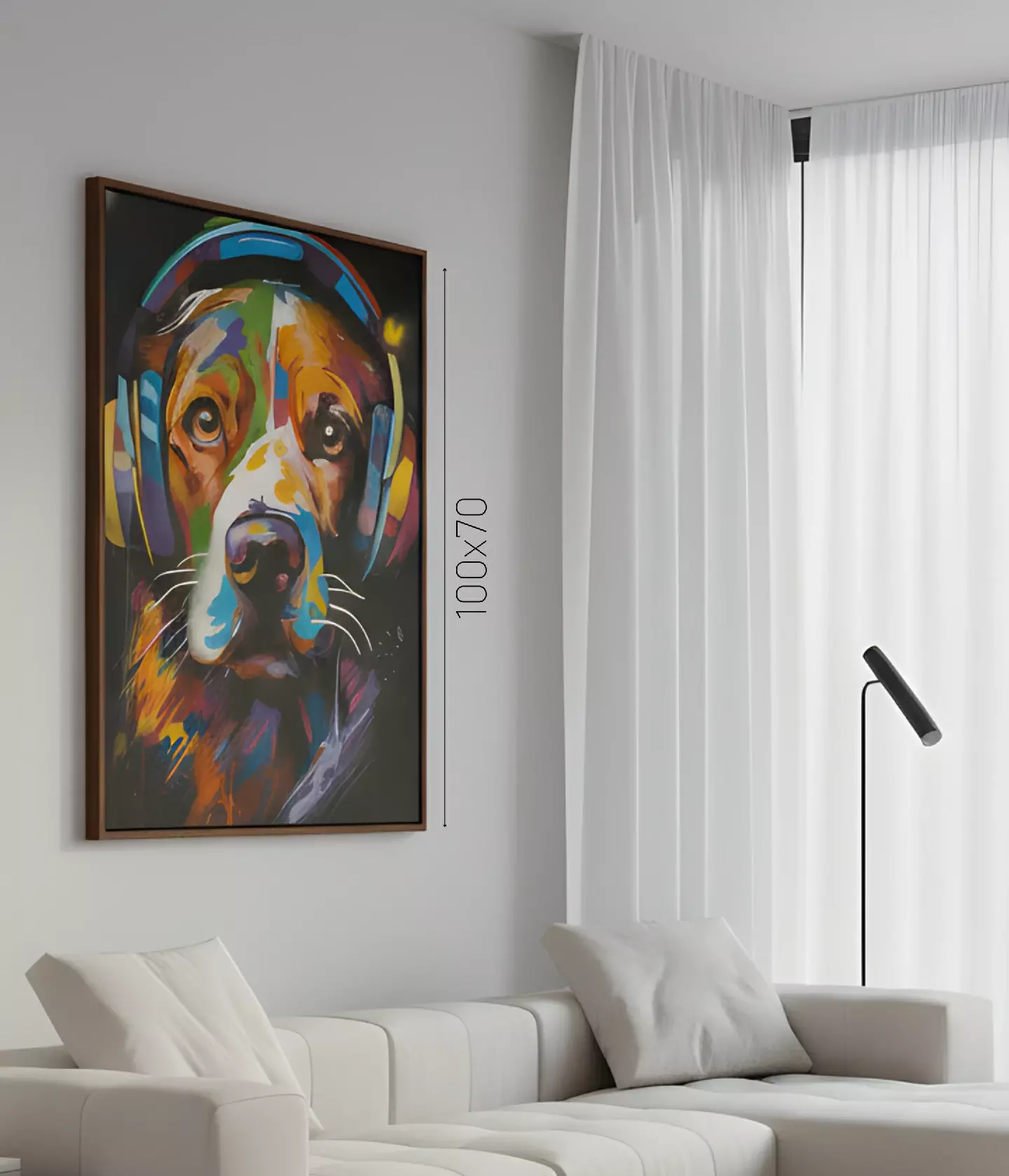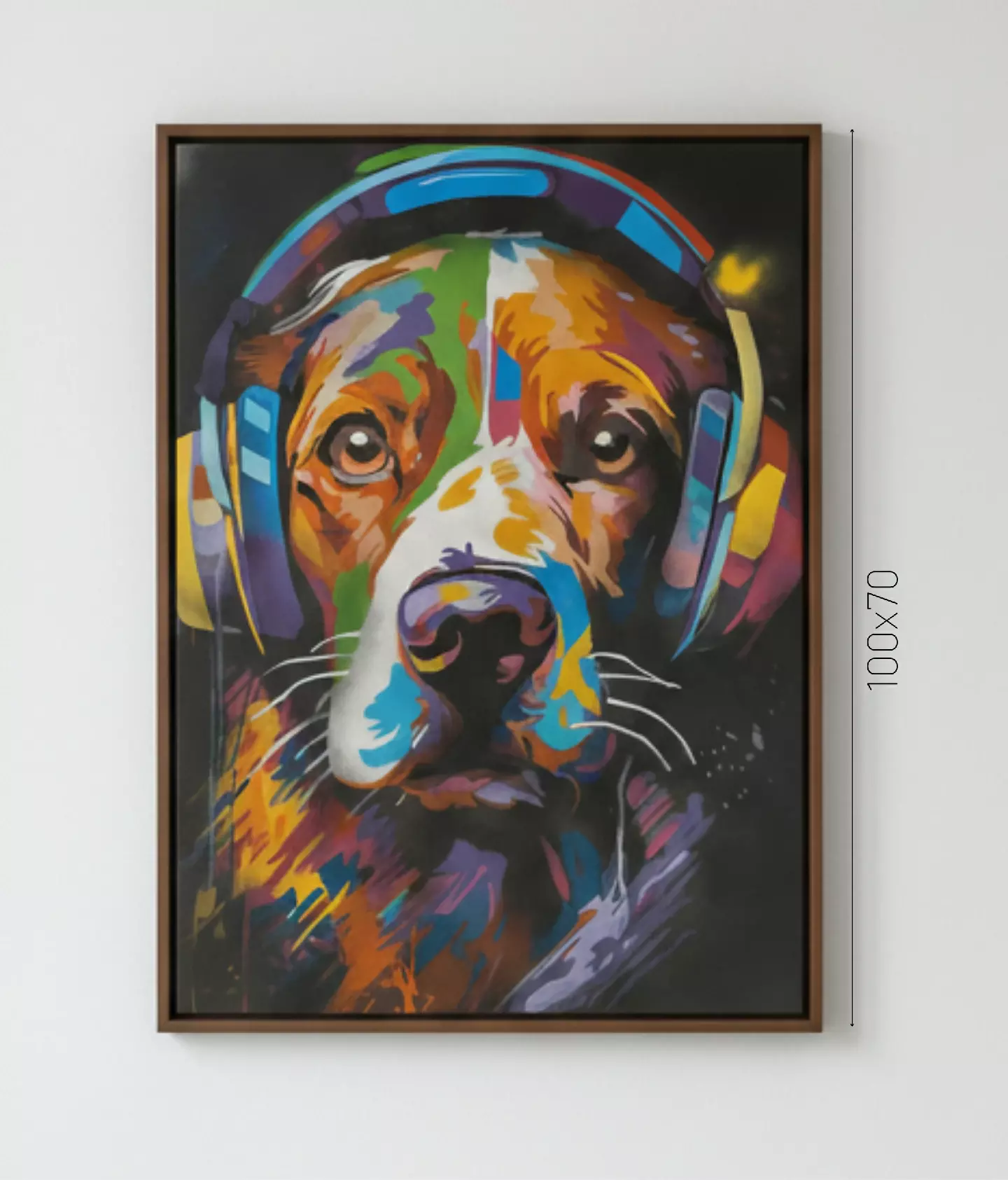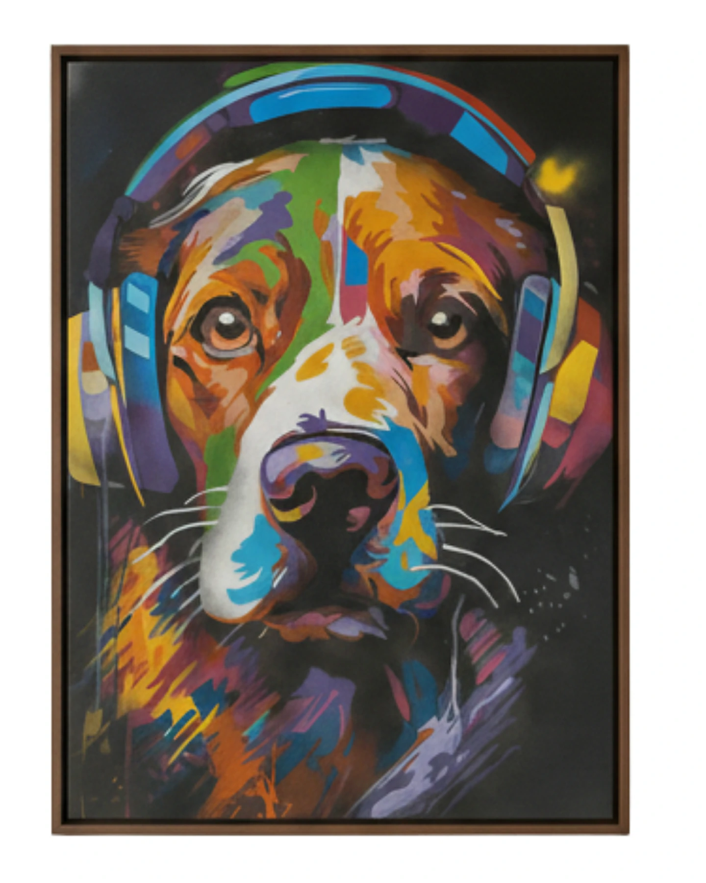 Nesta peça, o artista utiliza a combinação dinâmica de técnica spray e tinta acrílica sobre tela, criando um jogo visual de texturas e saturações. O retrato de um pet, possivelmente um cão, é transformado em um ícone pop, onde a figura é adornada com fones de ouvido, sugerindo uma fusão entre a lealdade animal e a cultura contemporânea da música e do estilo.