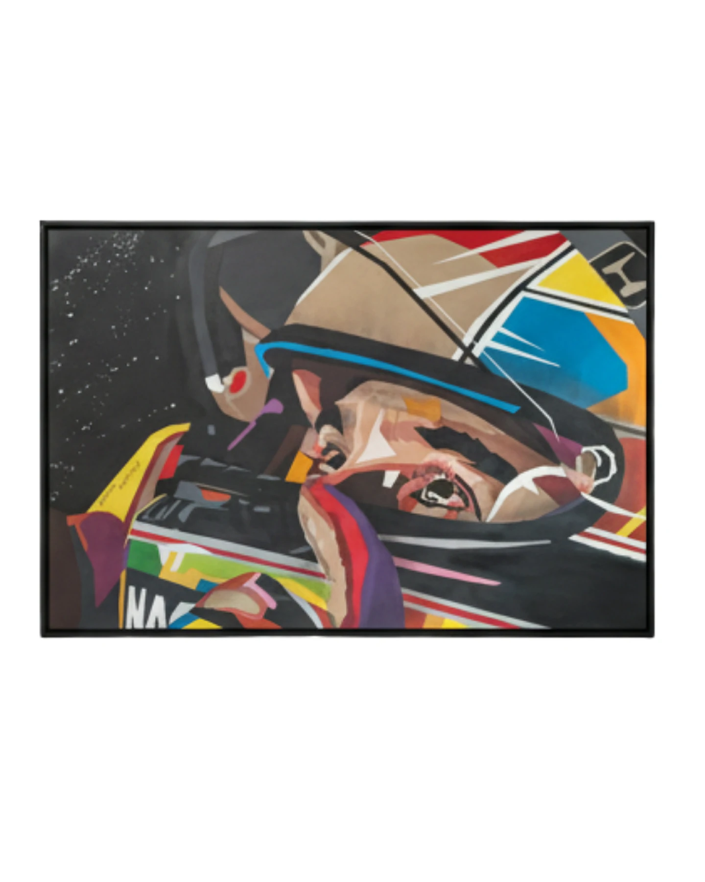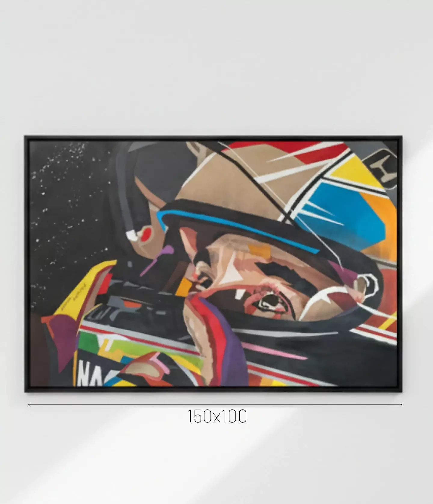 Esta obra de 150x100cm, dos artistas Adriana e Claudio Martucci, é pura emoção. Mais do que um retrato, é a representação da sua energia. A técnica de spray é usada para criar planos geométricos que definem o capacete e o rosto do piloto, fragmentando a imagem para revelar uma complexidade mais profunda.
