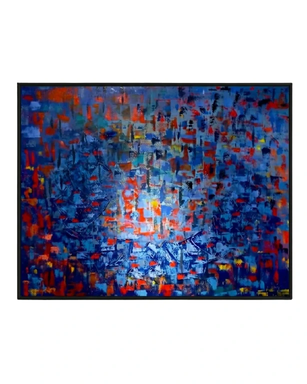 A paleta tensiona temperaturas e frequências: azuis quebradiços, vermelhos em flashes, amarelos pontuais que irrompem como distorções momentâneas. Não há domínio cromático, mas sim disputa, a cor atua como ruído sensível, uma vibração interrompida em trânsito.