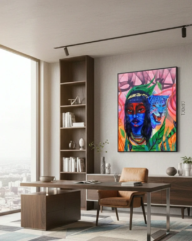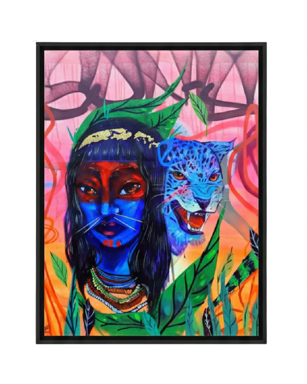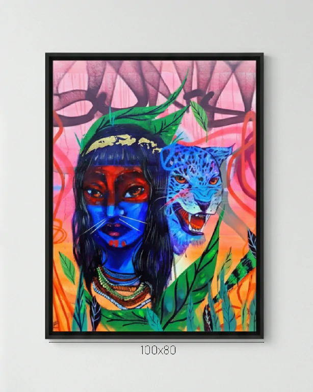 Apresentamos “Princesa Leonina”, uma pintura que é um verdadeiro manifesto de poder e conexão com a natureza. A figura central, com sua pintura corporal em azul profundo e traços que evocam a sabedoria ancestral, é ladeada pela face de uma onça azul vibrante – uma clara alusão à realeza e à ferocidade da selva.