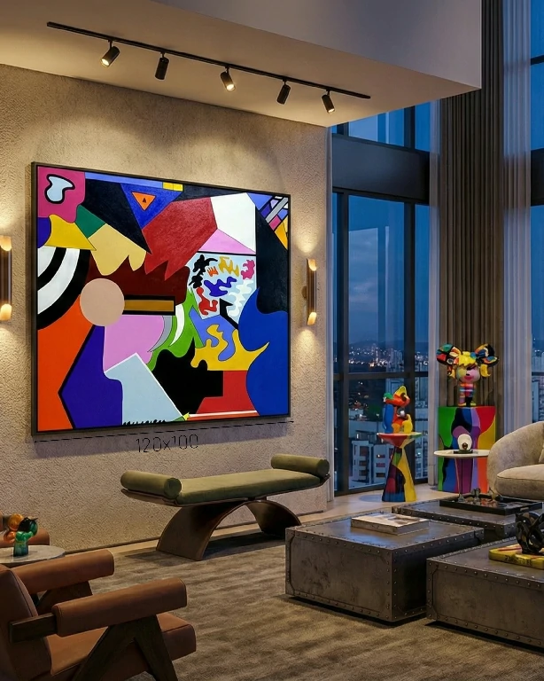 Impacto e Presença: Esta tela não é apenas uma decoração; é uma declaração. Sua escala e complexidade visual garantem que se torne o ponto focal de qualquer ambiente contemporâneo, seja em uma galeria, um escritório corporativo de alto padrão ou uma residência moderna.