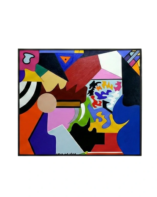 O Efeito “Puzzle” Complexo: A obra se desdobra como um quebra-cabeça visual, onde cada elemento se encaixa, mas mantém sua individualidade. Há uma interação contínua entre áreas de cor sólida e campos mais fragmentados e texturais, como a mancha colorida no centro-direita.