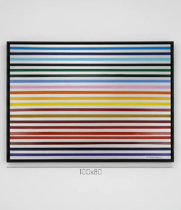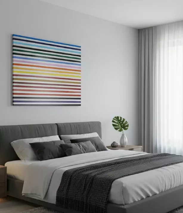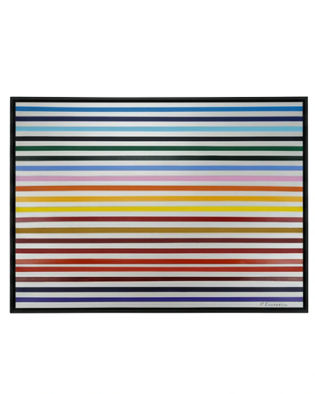 Em “RAIAS, MARES E RIOS”, Zanforlin utiliza a precisão das linhas horizontais para criar um visual hipnótico. Faixas de cores vibrantes se intercalam com o prata metálico refletor, evocando o brilho da água e a vastidão do horizonte. A repetição das formas gera um ritmo visual que acalma e, ao mesmo tempo, energiza o ambiente.
